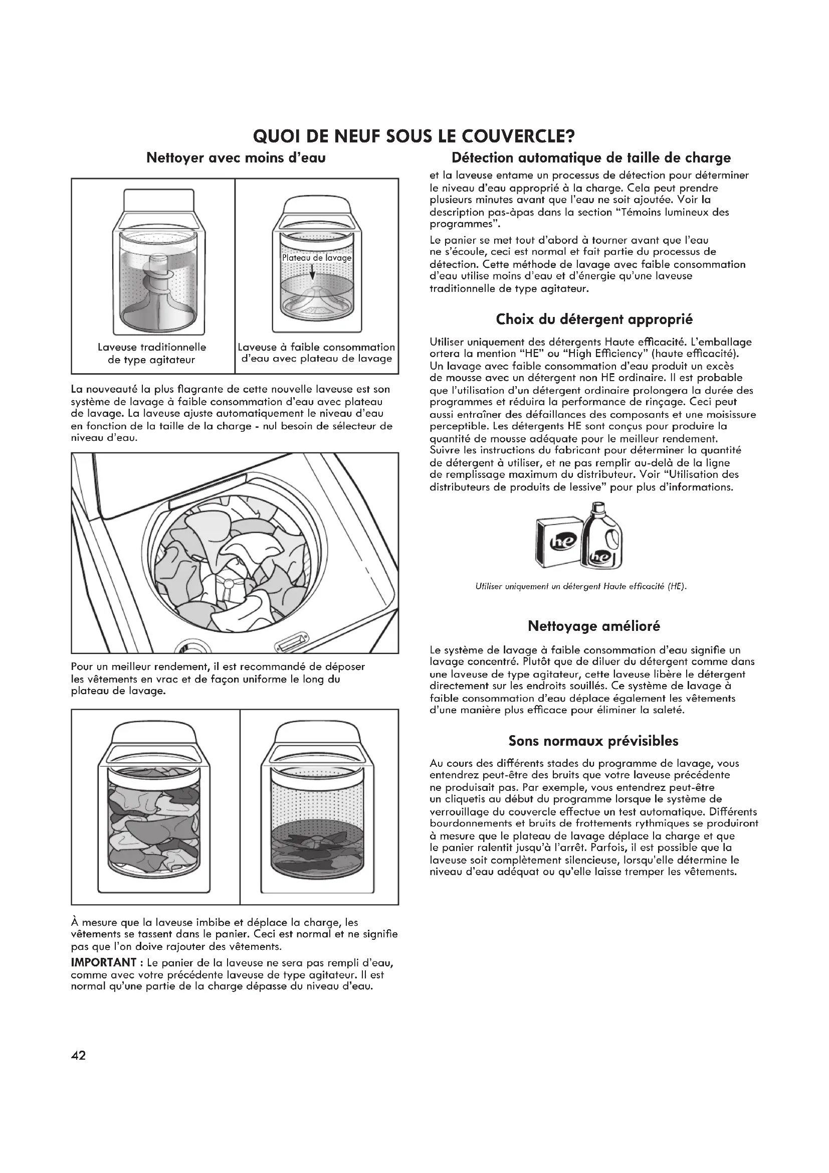 QUOI DE NEUF SOUS LE COUVERCLE? Pour un meilleur rendement, il est recommandé de déposer les vêtements en vrac et de façon uniforme le long du plateau de lavage À mesure que la laveuse imbibe et déplace la charge, les vêtements se tassent dans le panier. Ceci est normal et ne signie pas que l’on doive rajouter des vêtements IMPORTANT : Le panier de la laveuse ne sera pas rempli d’eau, comme avec votre précédente laveuse de type agitateur Il est normal qu’une partie de la charge dépasse du niveau d’eau Choix du détergent approprié Utiliser uniquement des détergents Haute ecacité. L’emballage ortera la mention “HE” ou “High Eciency” (haute ecacité). Un lavage avec faible consommation d’eau produit un excès de mousse avec un détergent non HE ordinaire Il est probable que l’utilisation d’un détergent ordinaire prolongera la durée des programmes et réduira la performance de rinçage Ceci peut aussi entraîner des défaillances des composants et une moisissure perceptible Les détergents HE sont conçus pour produire la quantité de mousse adéquate pour le meilleur rendement Suivre les instructions du fabricant pour déterminer la quantité de détergent à utiliser, et ne pas remplir au-delà de la ligne de remplissage maximum du distributeur Voir “Utilisation des distributeurs de produits de lessive” pour plus d’informations Sons normaux prévisibles Au cours des diérents stades du programme de lavage, vous entendrez peut-être des bruits que votre laveuse précédente ne produisait pas Par exemple, vous entendrez peut-être un cliquetis au début du programme lorsque le système de verrouillage du couvercle eectue un test automatique. Diérents bourdonnements et bruits de frottements rythmiques se produiront à mesure que le plateau de lavage déplace la charge et que le panier ralentit jusqu’à l’arrêt Parfois, il est possible que la laveuse soit complètement silencieuse, lorsqu’elle détermine le niveau d’eau adéquat ou qu’elle laisse tremper les vêtements Utiliser uniquement un détergent Haute efcacité (HE). Nettoyage amélioré Le système de lavage à faible consommation d’eau signie un lavage concentré Plutôt que de diluer du détergent comme dans une laveuse de type agitateur, cette laveuse libère le détergent directement sur les endroits souillés Ce système de lavage à faible consommation d’eau déplace également les vêtements d’une manière plus ecace pour éliminer la saleté. Nettoyer avec moins d’eau La nouveauté la plus agrante de cette nouvelle laveuse est son système de lavage à faible consommation d’eau avec plateau de lavage La laveuse ajuste automatiquement le niveau d’eau en fonction de la taille de la charge - nul besoin de sélecteur de niveau d’eau Laveuse traditionnelle de type agitateur Laveuse à faible consommation d’eau avec plateau de lavage Washplate Détection automatique de taille de charge et la laveuse entame un processus de détection pour déterminer le niveau d’eau approprié à la charge Cela peut prendre plusieurs minutes avant que l’eau ne soit ajoutée Voir la description pas-àpas dans la section “Témoins lumineux des programmes” Le panier se met tout d’abord à tourner avant que l’eau ne s’écoule, ceci est normal et fait partie du processus de détection Cette méthode de lavage avec faible consommation d’eau utilise moins d’eau et d’énergie qu’une laveuse traditionnelle de type agitateur Plateau de lavage43