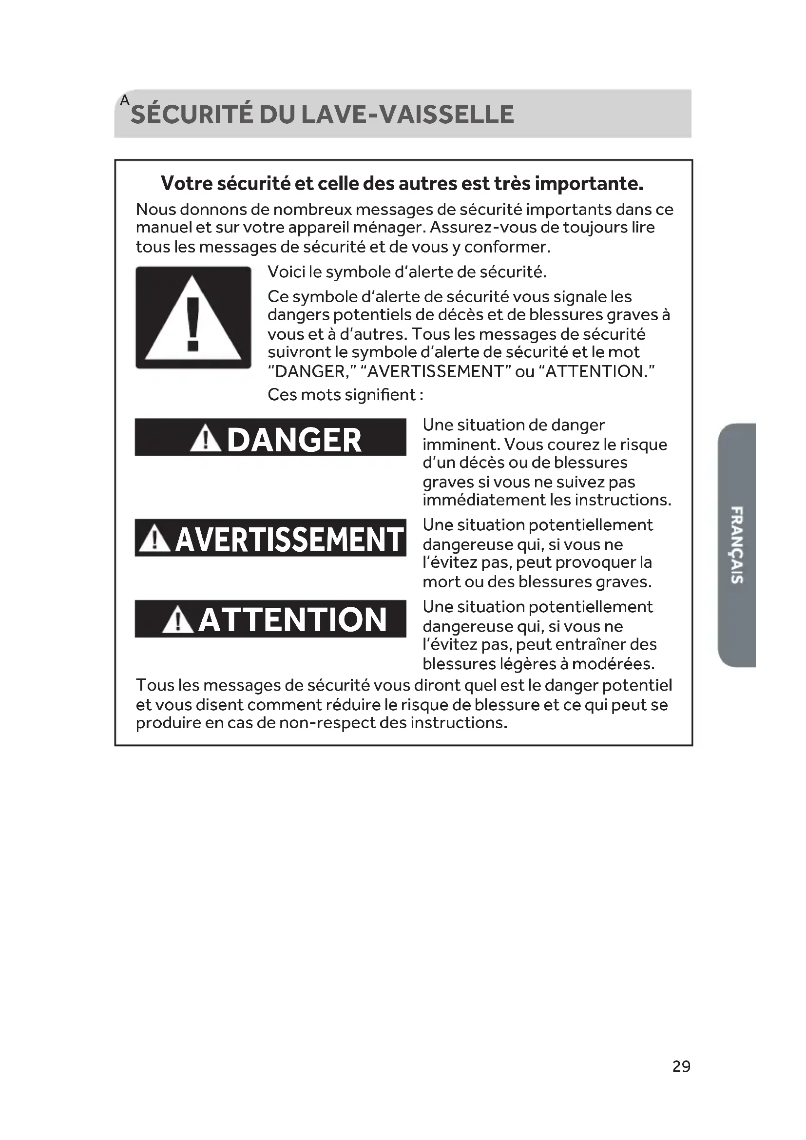 Votre sécurité et celle des autres est très importante. DANGER AVERTISSEMENT ATTENTION Voici le symbole d’alerte de sécurité. Ce symbole d’alerte de sécurité vous signale les dangers potentiels de décès et de blessures graves à vous et à d’autres. Tous les messages de sécurité suivront le symbole d’alerte de sécurité et le mot “DANGER,” “AVERTISSEMENT” ou “ATTENTION.” Ces mots signifient : Une situation de danger imminent. Vous courez le risque d’un décès ou de blessures graves si vous ne suivez pas immédiatement les instructions. Une situation potentiellement dangereuse qui, si vous ne l’évitez pas, peut provoquer la mort ou des blessures graves. Une situation potentiellement dangereuse qui, si vous ne l’évitez pas, peut entraîner des blessures légères à modérées. Tous les messages de sécurité vous diront quel est le danger potentiel et vous disent comment réduire le risque de blessure et ce qui peut se produire en cas de non-respect des instructions. Nous donnons de nombreux messages de sécurité importants dans ce manuel et sur votre appareil ménager. Assurez-vous de toujours lire tous les messages de sécurité et de vous y conformer.30 AVERTISSEMENT Risque de basculement Ne pas utiliser le lave-vaisselle jusqu’à ce qu’il soit complètement installé. Ne pas appuyer sur la porte ouverte. Le non-respect de ces instructions peut causer des blessures graves ou des coupures. CE QU’IL FAUT FAIRE :