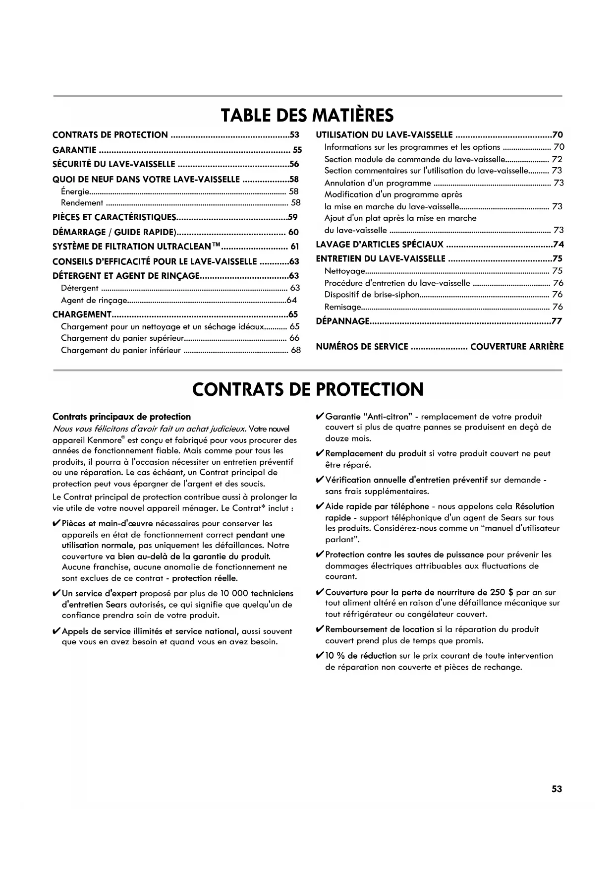 est conçu et fabriqué pour vous procurer des années de fonctionnement fiable. Mais comme pour tous les produits, il pourra à l'occasion nécessiter un entretien préventif ou une réparation. Le cas échéant, un Contrat principal de protection peut vous épargner de l'argent et des soucis. Le Contrat principal de protection contribue aussi à prolonger la vie utile de votre nouvel appareil ménager. Le Contrat* inclut : ✔Pièces et main-d'œuvre nécessaires pour conserver les appareils en état de fonctionnement correct pendant une utilisation normale, pas uniquement les défaillances. Notre couverture va bien au-delà de la garantie du produit. Aucune franchise, aucune anomalie de fonctionnement ne sont exclues de ce contrat - protection réelle. ✔Un service d'expert proposé par plus de 10 000 techniciens d'entretien Sears autorisés, ce qui signifie que quelqu'un de confiance prendra soin de votre produit. ✔Appels de service illimités et service national, aussi souvent que vous en avez besoin et quand vous en avez besoin. ✔Garantie “Anti-citron” - remplacement de votre produit couvert si plus de quatre pannes se produisent en deçà de douze mois. ✔Remplacement du produit si votre produit couvert ne peut être réparé. ✔Vérification annuelle d'entretien préventif sur demande - sans frais supplémentaires. ✔Aide rapide par téléphone - nous appelons cela Résolution rapide - support téléphonique d'un agent de Sears sur tous les produits. Considérez-nous comme un “manuel d'utilisateur parlant”. ✔Protection contre les sautes de puissance pour prévenir les dommages électriques attribuables aux fluctuations de courant. ✔Couverture pour la perte de nourriture de 250 $ par an sur tout aliment altéré en raison d'une défaillance mécanique sur tout réfrigérateur ou congélateur couvert. ✔Remboursement de location si la réparation du produit couvert prend plus de temps que promis. ✔10 % de réduction sur le prix courant de toute intervention de réparation non couverte et pièces de rechange.54 Dès que vous achetez le Contrat, il suffit d'un appel téléphonique pour obtenir un rendez-vous de service. Vous pouvez appeler en tout temps jour et nuit ou prendre un rendez- vous de service en direct. Le Contrat principal de protection constitue un investissement sans risque. Si vous annulez pour une quelconque raison pendant la période de garantie du produit, nous vous rembourserons intégralement ou nous vous verserons un remboursement au prorata après l'expiration de la période de garantie. Achetez votre Contrat principal de protection aujourd'hui même! Certaines limitations et exclusions s'appliquent. Pour des prix et renseignements supplémentaires aux États-Unis, composez le