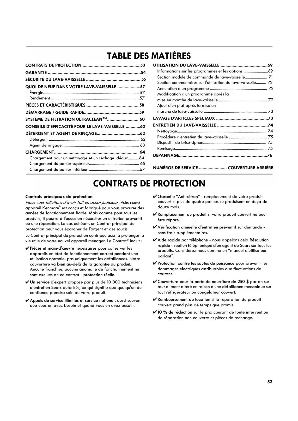 est conçu et fabriqué pour vous procurer des années de fonctionnement fiable. Mais comme pour tous les produits, il pourra à l'occasion nécessiter un entretien préventif ou une réparation. Le cas échéant, un Contrat principal de protection peut vous épargner de l'argent et des soucis. Le Contrat principal de protection contribue aussi à prolonger la vie utile de votre nouvel appareil ménager. Le Contrat* inclut : ✔Pièces et main-d'œuvre nécessaires pour conserver les appareils en état de fonctionnement correct pendant une utilisation normale, pas uniquement les défaillances. Notre couverture va bien au-delà de la garantie du produit. Aucune franchise, aucune anomalie de fonctionnement ne sont exclues de ce contrat - protection réelle. ✔Un service d'expert proposé par plus de 10 000 techniciens d'entretien Sears autorisés, ce qui signifie que quelqu'un de confiance prendra soin de votre produit. ✔Appels de service illimités et service national, aussi souvent que vous en avez besoin et quand vous en avez besoin. ✔Garantie “Anti-citron” - remplacement de votre produit couvert si plus de quatre pannes se produisent en deçà de douze mois. ✔Remplacement du produit si votre produit couvert ne peut être réparé. ✔Vérification annuelle d'entretien préventif sur demande - sans frais supplémentaires. ✔Aide rapide par téléphone - nous appelons cela Résolution rapide - soutien téléphonique d'un agent de Sears sur tous les produits. Considérez-nous comme un “manuel d'utilisateur parlant”. ✔Protection contre les sautes de puissance pour prévenir les dommages électriques attribuables aux fluctuations de courant. ✔Couverture pour la perte de nourriture de 250 $ par an sur tout aliment altéré en raison d'une défaillance mécanique sur tout réfrigérateur ou congélateur couvert. ✔Remboursement de location si la réparation du produit couvert prend plus de temps que promis. ✔10 % de réduction sur le prix courant de toute intervention de réparation non couverte et pièces de rechange.54 Dès que vous achetez le Contrat, il suffit d'un appel téléphonique pour obtenir un rendez-vous de service. Vous pouvez appeler en tout temps jour et nuit ou prendre un rendez- vous de service en direct. Le Contrat principal de protection constitue un investissement sans risque. Si vous annulez pour une quelconque raison pendant la période de garantie du produit, nous vous rembourserons intégralement ou nous vous verserons un remboursement au prorata après l'expiration de la période de garantie. Achetez votre Contrat principal de protection aujourd'hui même! Certaines limitations et exclusions s'appliquent. Pour des prix et renseignements supplémentaires aux États-Unis, composez le
