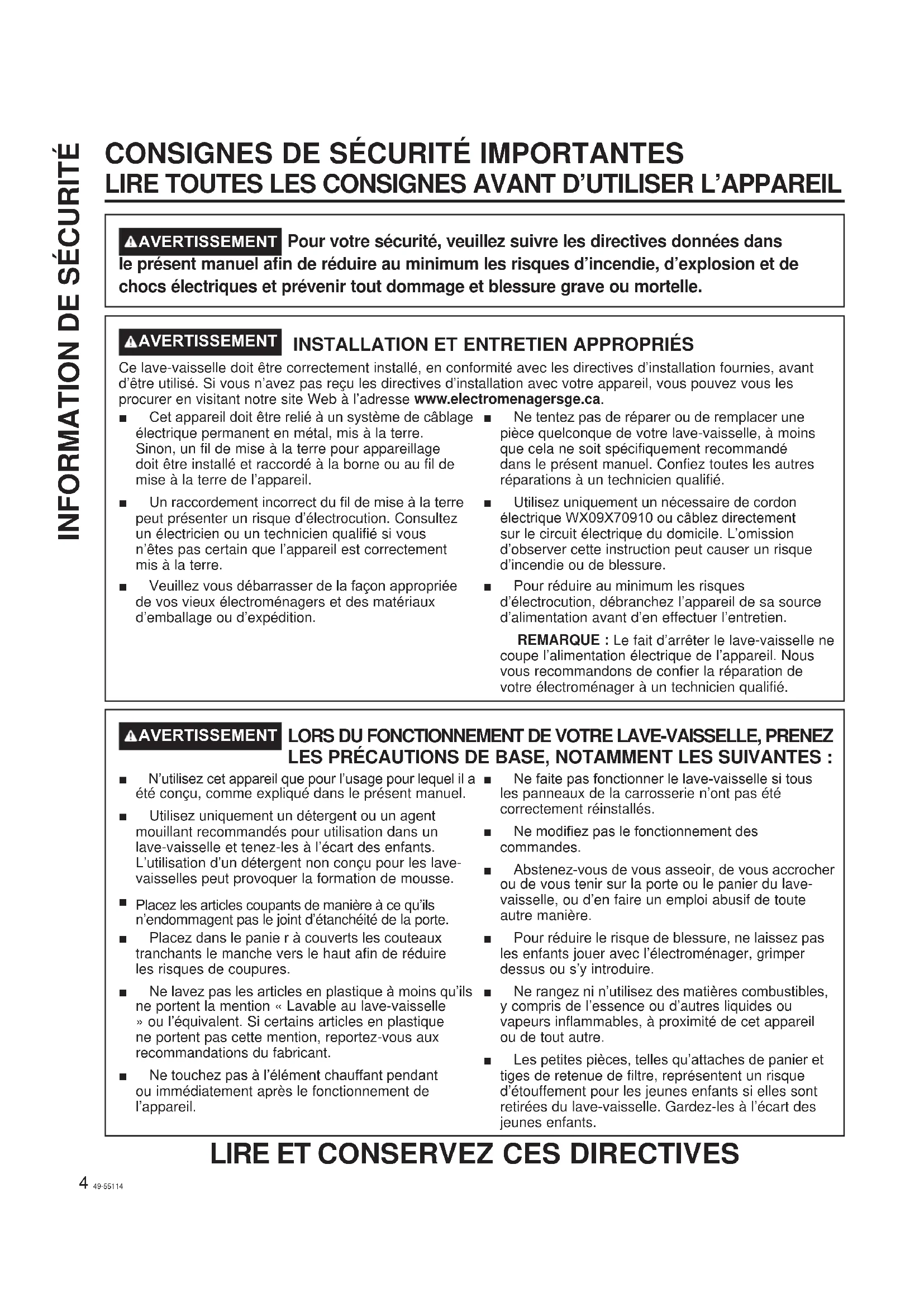 Ce lave-vaisselle doit être correctement installé, en conformité avec les directives d’installation fournies, avant d’être utilisé. Si vous n’avez pas reçu les directives d’installation avec votre appareil, vous pouvez vous les procurer en visitant notre site Web à l’adresse www.electromenagersge.ca. Ŷ &HWDSSDUHLOGRLWrWUHUHOLpjXQV\VWqPHGHFkEODJHélectrique permanent en métal, mis à la terre. Sinon, un fil de mise à la terre pour appareillage doit être installé et raccordé à la borne ou au fil de mise à la terre de l’appareil.Ŷ 8QUDFFRUGHPHQWLQFRUUHFWGXILOGHPLVHjODWHUUHpeut présenter un risque d’électrocution. Consultez un électricien ou un technicien qualifié si vous n’êtes pas certain que l’appareil est correctement mis à la terre.Ŷ 9HXLOOH]YRXVGpEDUUDVVHUGHODIDoRQDSSURSULpHde vos vieux électroménagers et des matériaux d’emballage ou d’expédition. Ŷ 1HWHQWH]SDVGHUpSDUHURXGHUHPSODFHUXQHpièce quelconque de votre lave-vaisselle, à moins que cela ne soit spécifiquement recommandé dans le présent manuel. Confiez toutes les autres réparations à un technicien qualifié.Ŷ 8WLOLVH]XQLTXHPHQWXQQpFHVVDLUHGHFRUGRQpOHFWULTXH:;;RXFkEOH]GLUHFWHPHQWsur le circuit électrique du domicile. L’omission d’observer cette instruction peut causer un risque d’incendie ou de blessure.Ŷ 3RXUUpGXLUHDXPLQLPXPOHVULVTXHVd’électrocution, débranchez l’appareil de sa source d’alimentation avant d’en effectuer l’entretien. REMARQUE : Le fait d’arrêter le lave-vaisselle ne coupe l’alimentation électrique de l’appareil. Nous vous recommandons de confier la réparation de votre électroménager à un technicien qualifié. AVERTISSEMENT LORS DU FONCTIONNEMENT DE VOTRE LAVE-VAISSELLE, PRENEZ LES PRÉCAUTIONS DE BASE, NOTAMMENT LES SUIVANTES : Ŷ 1¶XWLOLVH]FHWDSSDUHLOTXHSRXUO¶XVDJHSRXUOHTXHOLODété conçu, comme expliqué dans le présent manuel.Ŷ 8WLOLVH]XQLTXHPHQWXQGpWHUJHQWRXXQDJHQWmouillant recommandés pour utilisation dans un lave-vaisselle et tenez-les à l’écart des enfants. L’utilisation d’un détergent non conçu pour les lave-vaisselles peut provoquer la formation de mousse. 3ODFH]OHVDUWLFOHVFRXSDQWVGHPDQLqUHjFHTX¶LOVn’endommagent pas le joint d’étanchéité de la porte.Ŷ 3ODFH]GDQVOHSDQLHUjFRXYHUWVOHVFRXWHDX[tranchants le manche vers le haut afin de réduire les risques de coupures.Ŷ 1HODYH]SDVOHVDUWLFOHVHQSODVWLTXHjPRLQVTX¶LOVne portent la mention « Lavable au lave-vaisselle » ou l’équivalent. Si certains articles en plastique ne portent pas cette mention, reportez-vous aux recommandations du fabricant.Ŷ 1HWRXFKH]SDVjO¶pOpPHQWFKDXIIDQWSHQGDQWou immédiatement après le fonctionnement de l’appareil.Ŷ 1HIDLWHSDVIRQFWLRQQHUOHODYHYDLVVHOOHVLWRXVles panneaux de la carrosserie n’ont pas été correctement réinstallés.Ŷ 1HPRGLILH]SDVOHIRQFWLRQQHPHQWGHVcommandes.Ŷ $EVWHQH]YRXVGHYRXVDVVHRLUGHYRXVDFFURFKHUou de vous tenir sur la porte ou le panier du lave-vaisselle, ou d’en faire un emploi abusif de toute autre manière.Ŷ 3RXUUpGXLUHOHULVTXHGHEOHVVXUHQHODLVVH]SDVles enfants jouer avec l’électroménager, grimper dessus ou s’y introduire.Ŷ 1HUDQJH]QLQ¶XWLOLVH]GHVPDWLqUHVFRPEXVWLEOHVy compris de l’essence ou d’autres liquides ou vapeurs inflammables, à proximité de cet appareil ou de tout autre.Ŷ /HVSHWLWHVSLqFHVWHOOHVTX¶DWWDFKHVGHSDQLHUHWtiges de retenue de filtre, représentent un risque d’étouffement pour les jeunes enfants si elles sont retirées du lave-vaisselle. Gardez-les à l’écart des jeunes enfants.49-55114 5