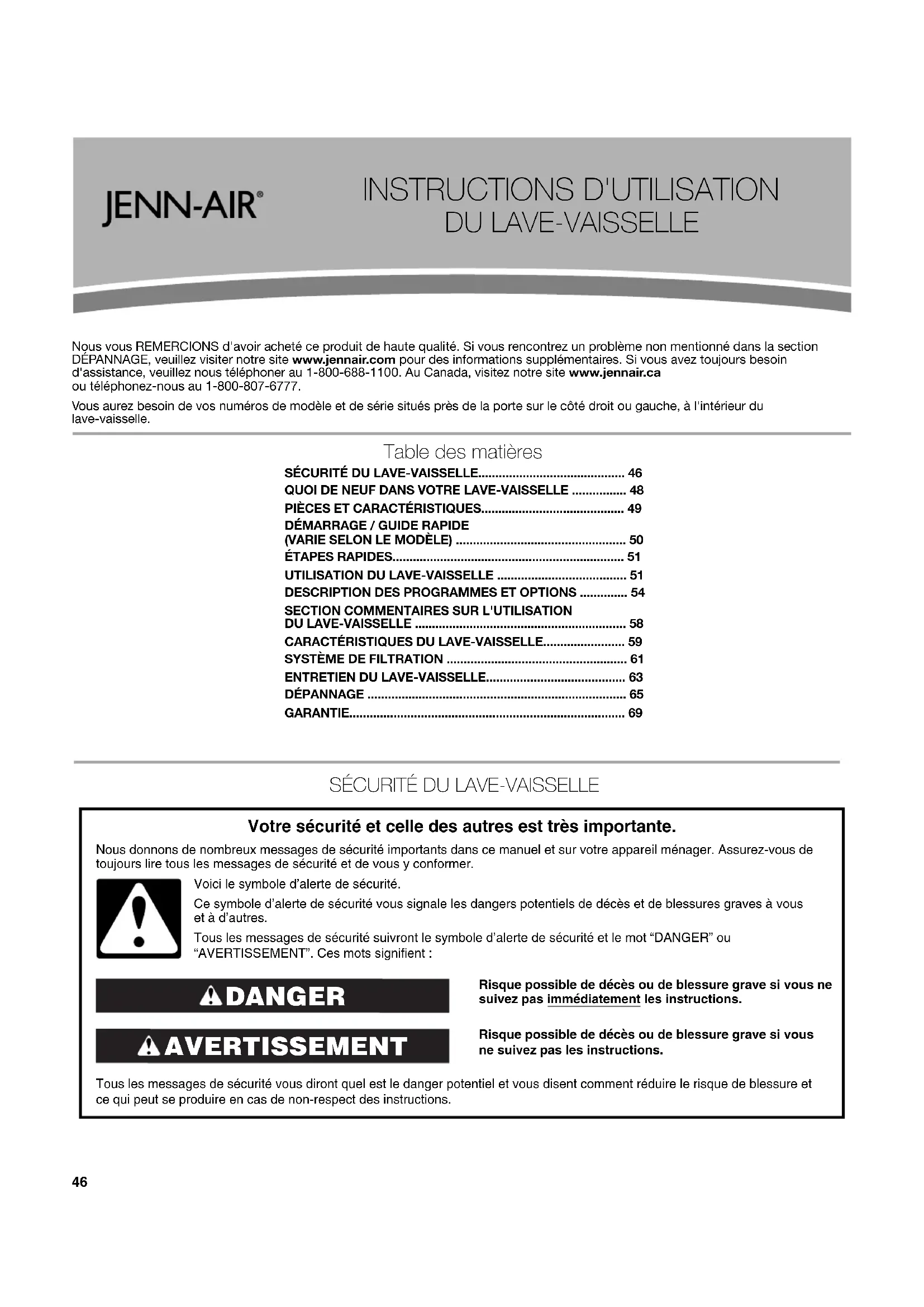 Nous vous REMERCIONS d'avoir acheté ce produit de haute qualité. Si vous rencontrez un problème non mentionné dans la section DÉPANNAGE, veuillez visiter notre site www.jennair.com pour des informations supplémentaires. Si vous avez toujours besoin d'assistance, veuillez nous téléphoner au 1-800-688-1100. Au Canada, visitez notre site www.jennair.ca ou téléphonez-nous au 1-800-807-6777.
