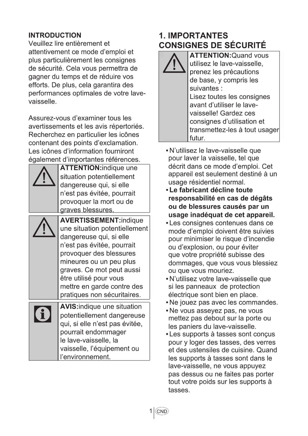 CND INTRODUCTION Veuillez lire entièrement et attentivement ce mode d’emploi et plus particulièrement les consignes de sécurité. Cela vous permettra de gagner du temps et de réduire vos efforts. De plus, cela garantira des performances optimales de votre lave- vaisselle. Assurez-vous d’examiner tous les avertissements et les avis répertoriés. Recherchez en particulier les icônes contenant des points d’exclamation. Les icônes d’information fourniront également d’importantes références.