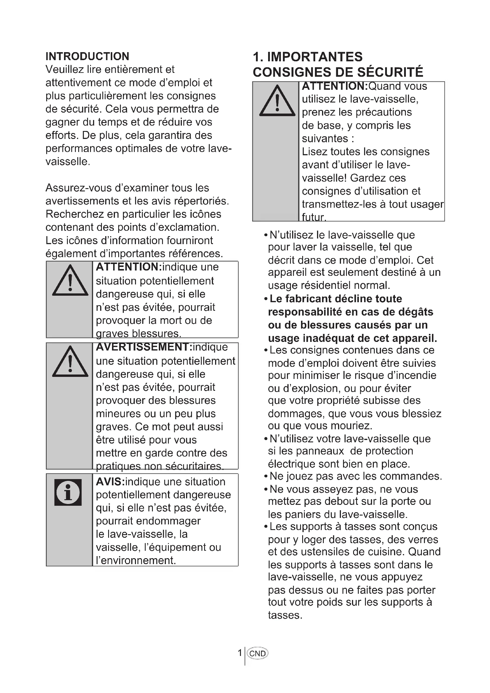 CND INTRODUCTION Veuillez lire entièrement et attentivement ce mode d’emploi et plus particulièrement les consignes de sécurité. Cela vous permettra de gagner du temps et de réduire vos efforts. De plus, cela garantira des performances optimales de votre lave- vaisselle. Assurez-vous d’examiner tous les avertissements et les avis répertoriés. Recherchez en particulier les icônes contenant des points d’exclamation. Les icônes d’information fourniront également d’importantes références.