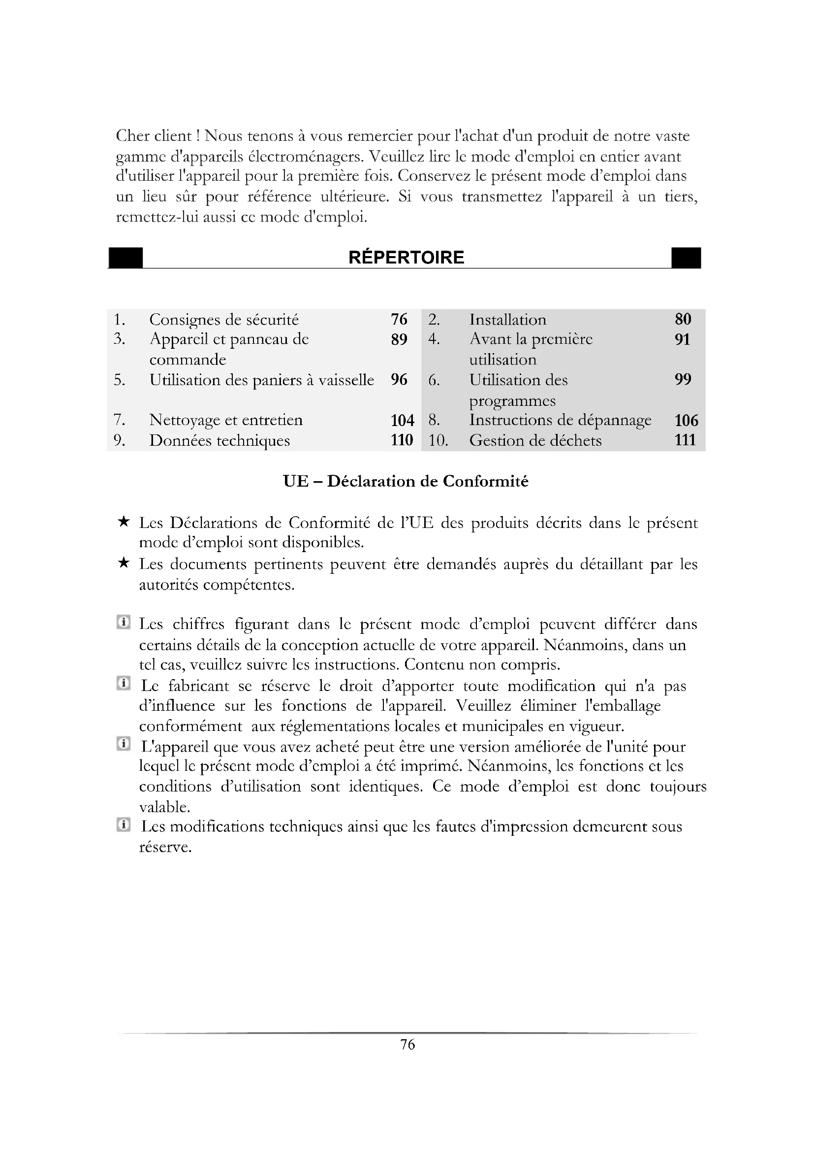 UE – Déclaration de Conformité Les Déclarations de Conformité de l’UE des produits décrits dans le présent mode d’emploi sont disponibles. Les documents pertinents peuvent être demandés auprès du détaillant par les autorités compétentes. Les chiffres figurant dans le présent mode d’emploi peuvent différer dans certains détails de la conception actuelle de votre appareil. Néanmoins, dans un tel cas, veuillez suivre les instructions. Contenu non compris. Le fabricant se réserve le droit d’apporter toute modification qui n'a pas d’influence sur les fonctions de l'appareil. Veuillez éliminer l'emballage conformément aux réglementations locales et municipales en vigueur. L'appareil que vous avez acheté peut être une version améliorée de l'unité pour lequel le présent mode d’emploi a été imprimé. Néanmoins, les fonctions et les conditions d’utilisation sont identiques. Ce mode d’emploi est donc toujours valable. Les modifications techniques ainsi que les fautes d'impression demeurent sous réserve.77