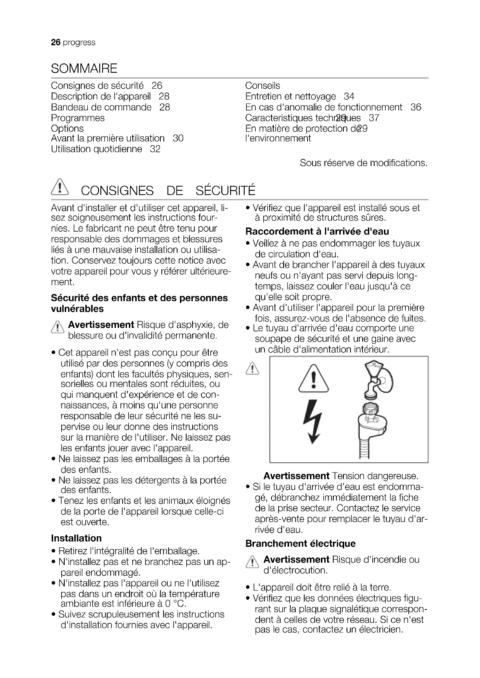 progress 25SOMMAIRE Consignes de sécurité 26 Description de l'appareil 28 Bandeau de commande 28 Programmes 29 Options 29 Avant la première utilisation 30 Utilisation quotidienne 32 Conseils 33 Entretien et nettoyage 34 En cas d'anomalie de fonctionnement 36 Caracteristiques techniques 37 En matière de protection de l'environnement 37 Sous réserve de modifications.
