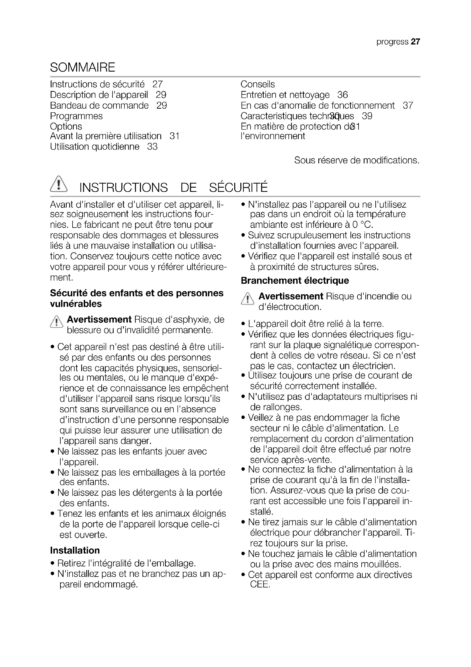 26 progressSOMMAIRE Instructions de sécurité 27 Description de l'appareil 29 Bandeau de commande 29 Programmes 30 Options 31 Avant la première utilisation 31 Utilisation quotidienne 33 Conseils 35 Entretien et nettoyage 36 En cas d'anomalie de fonctionnement 37 Caracteristiques techniques 39 En matière de protection de l'environnement 39 Sous réserve de modifications.