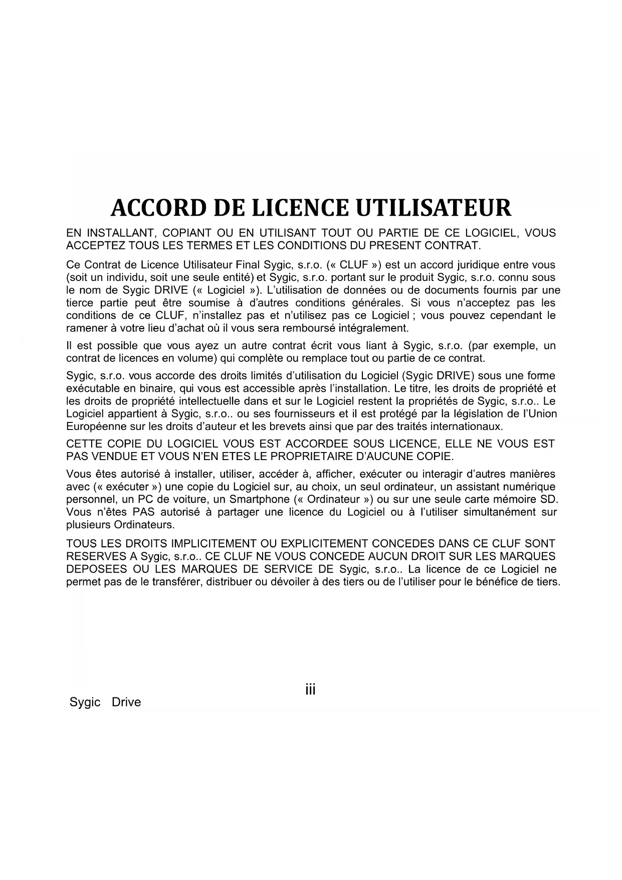 Ce Contrat de Licence Utilisateur Final Sygic, s. r. o. (« CLUF ») est un accord juridique entre vous (soit un individu, soit une seule entité) et Sygic, s. r. o. portant sur le produit Sygic, s. r. o. connu sous le nom de Sygic DRIVE (« Logiciel »). L'utilisation de données ou de documents fournis par une tierce partie peut être soumise à d'autres conditions générales. Si vous n'acceptez pas les conditions de ce CLUF, n'installez pas et n'utilisez pas ce Logiciel; vous pouvez cependant le ramener à votre lieu d'achat où il vous sera remboursé intégralement.