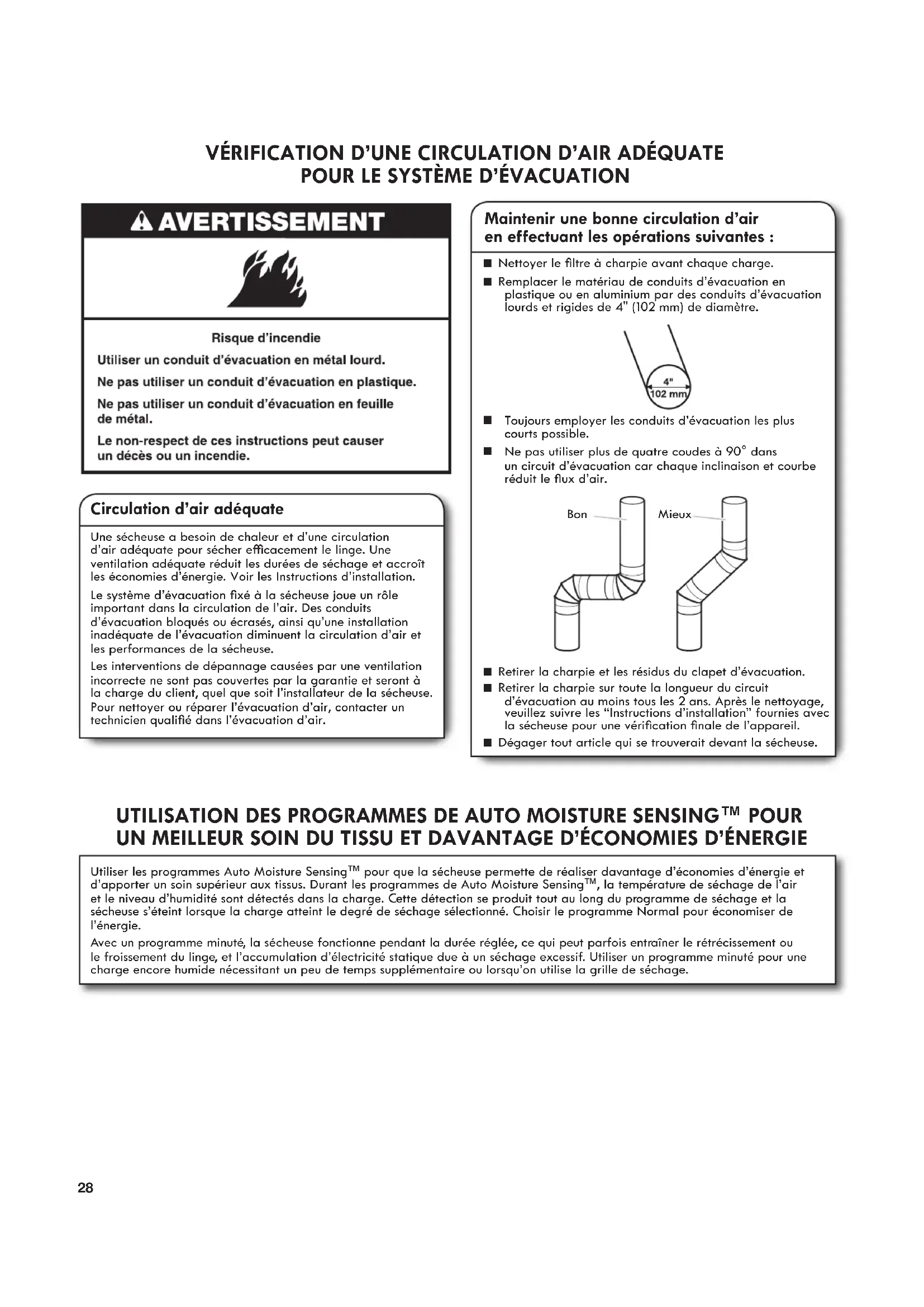 Les interventions de dépannage causées par une ventilation incorrecte ne sont pas couvertes par la garantie et seront à la charge du client, quels que soit l'installateur de la secheuse. Pour nettoyer ou réparer l'évacuation d'air, contacter un technicien qualifié dans l'évacuation d'air.
