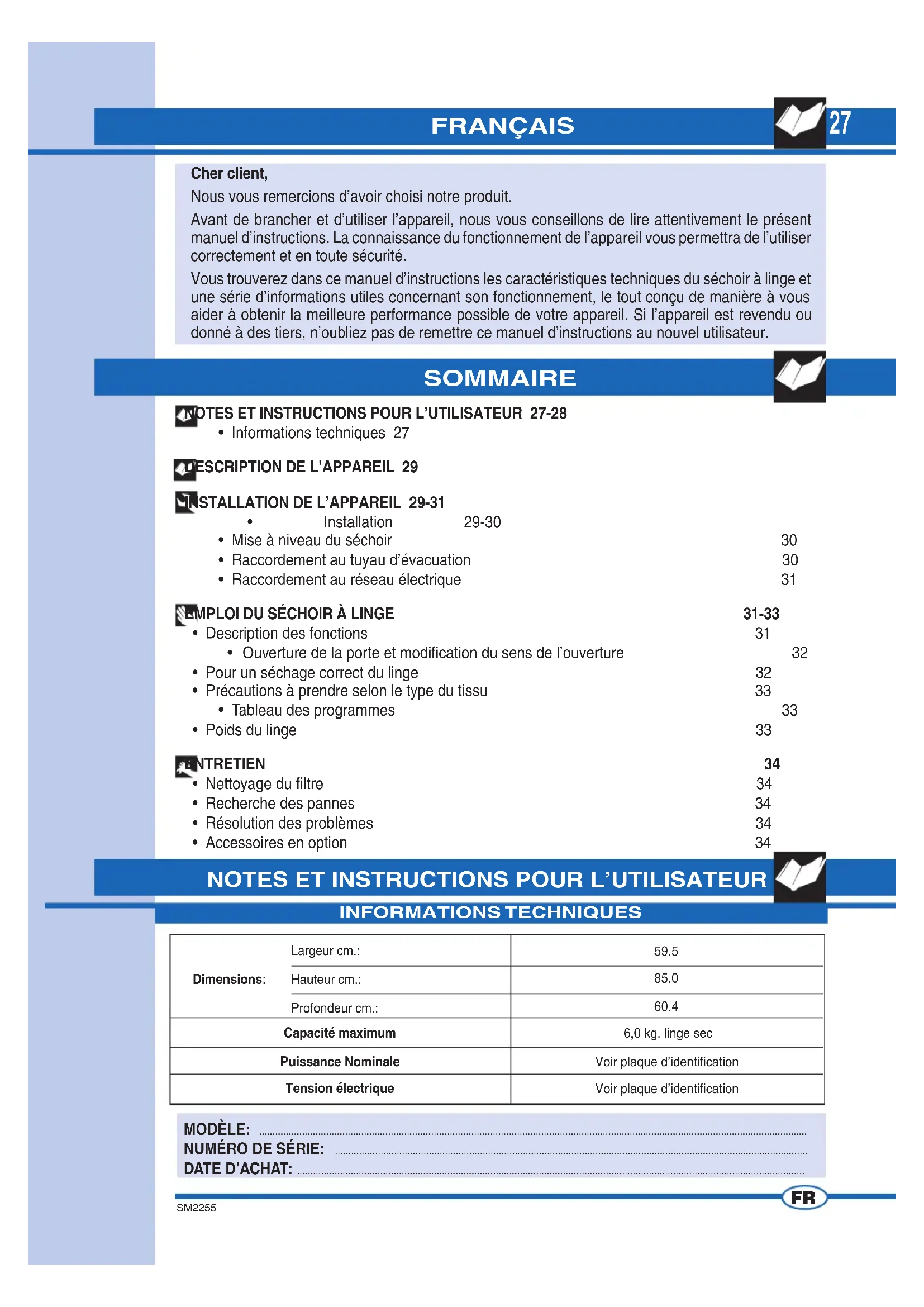 Um Platz zu sparen hält Ihr Händler ein Zubehör bereit, mit dem der Trockner auf einer Frontla- derwaschmaschine installiert werden kann. Ihr Installateur kann Ihnen sagen, welches Modell sich für die Installation mit diesem Zubehör eignet.27 SM2255 SOMMAIRE MODÈLE: ............................................................................................................................................................................................................ NUMÉRO DE SÉRIE: ................................................................................................................................................................................ DATE D’ACHAT: ............................................................................................................................................................................................. FRANÇAIS Cher client, Nous vous remercions d’avoir choisi notre produit. Avant de brancher et d’utiliser l’appareil, nous vous conseillons de lire attentivement le présent manuel d’instructions. La connaissance du fonctionnement de l’appareil vous permettra de l’utiliser correctement et en toute sécurité. Vous trouverez dans ce manuel d’instructions les caractéristiques techniques du séchoir à linge et une série d’informations utiles concernant son fonctionnement, le tout conçu de manière à vous aider à obtenir la meilleure performance possible de votre appareil. Si l’appareil est revendu ou donné à des tiers, n’oubliez pas de remettre ce manuel d’instructions au nouvel utilisateur.