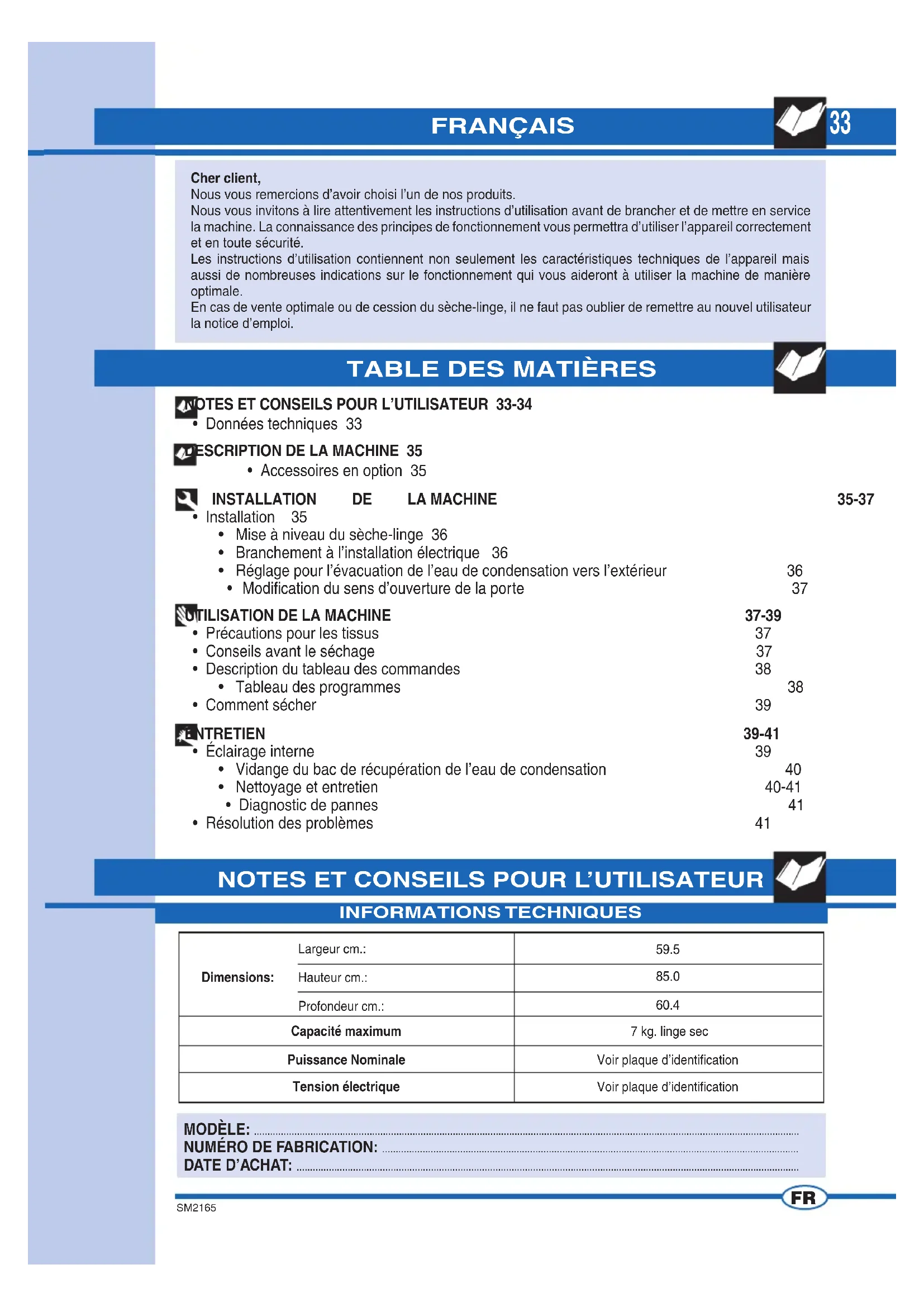 MODÈLE: ........................................................................................................................................................................................................... NUMÉRO DE FABRICATION: ........................................................................................................................................................... DATE D’ACHAT: ........................................................................................................................................................................................... FRANÇAIS Cher client, Nous vous remercions d’avoir choisi l’un de nos produits. Nous vous invitons à lire attentivement les instructions d’utilisation avant de brancher et de mettre en service la machine. La connaissance des principes de fonctionnement vous permettra d’utiliser l’appareil correctement et en toute sécurité. Les instructions d’utilisation contiennent non seulement les caractéristiques techniques de l’appareil mais aussi de nombreuses indications sur le fonctionnement qui vous aideront à utiliser la machine de manière optimale. En cas de vente optimale ou de cession du sèche-linge, il ne faut pas oublier de remettre au nouvel utilisateur la notice d’emploi. NOTES ET CONSEILS POUR L’UTILISATEUR 33-34