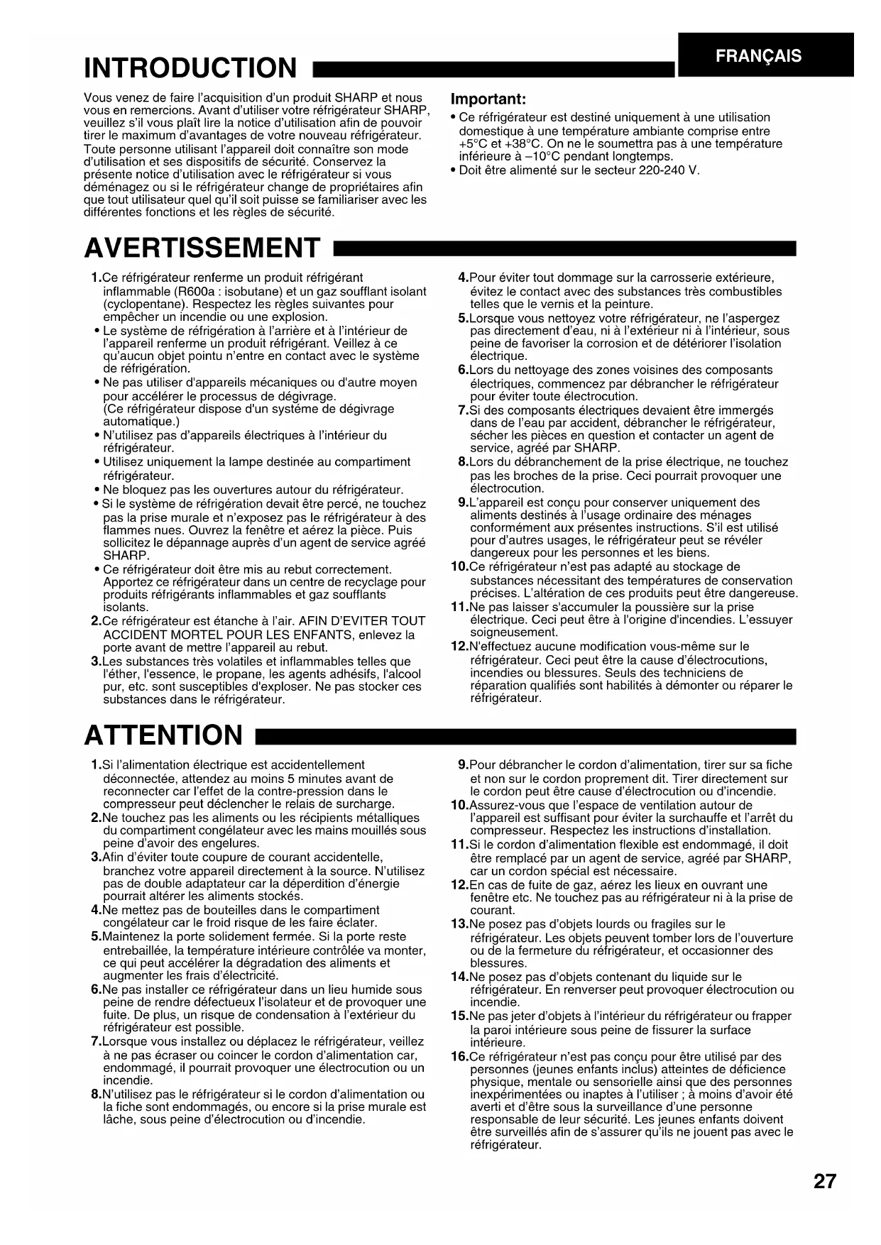 - Ce réfrigérateur est destiné uniquement à une utilisation domestique à une température ambiante comprise entre +5°C et +38°C. On ne le soumettra pas à une température inférieure à –10°C pendant longtemps.• Doit être alimenté sur le secteur 220-240 V. AVERTISSEMENT 1.Ce réfrigérateur renferme un produit réfrigérant inflammable (R600a : isobutane) et un gaz soufflant isolant (cyclopentane). Respectez les règles suivantes pour empêcher un incendie ou une explosion.