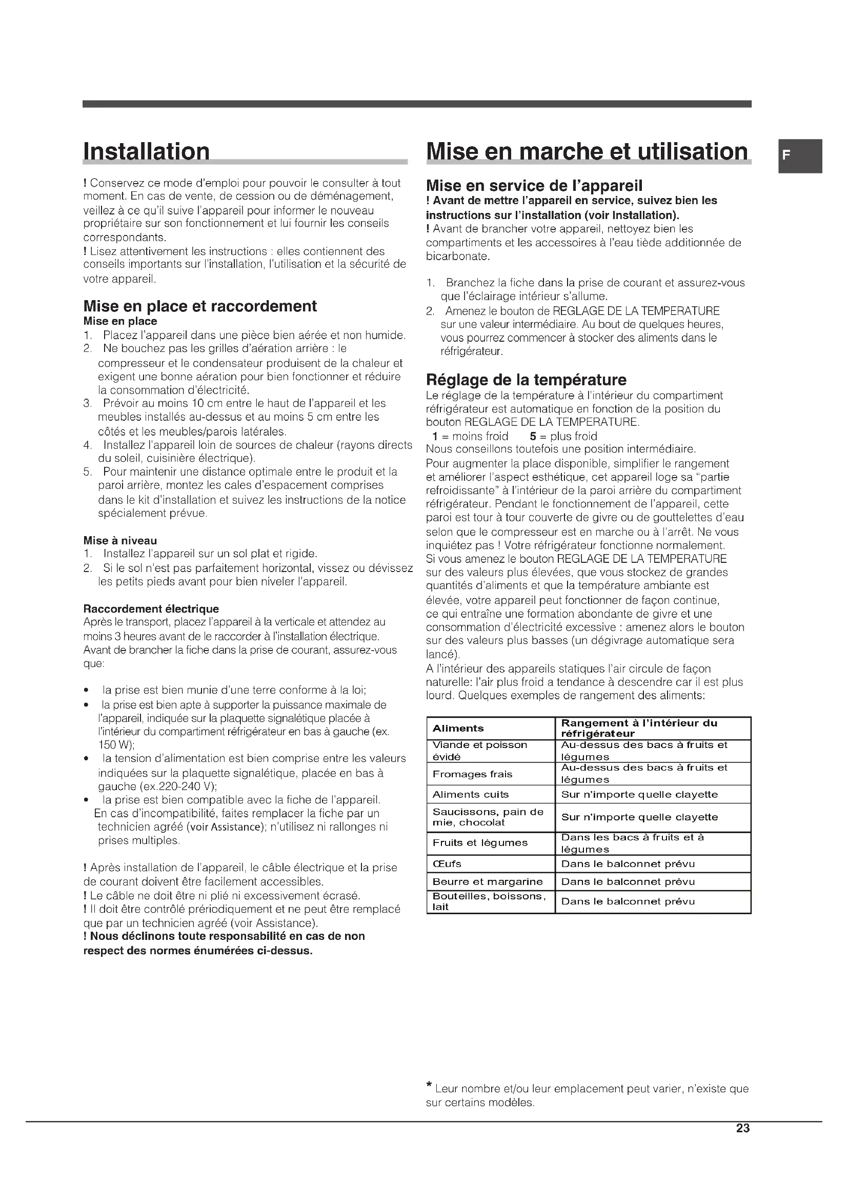 surunevaleurintermédiaire.Auboutdequelquesheures, vouspourrezcommenceràstockerdesalimentsdansle réfrigérateur. Réglage de la température Leréglagedelatempératureàl’intérieurducompartiment réfrigérateurestautomatiqueenfonctiondelapositiondu boutonREGLAGEDELATEMPERATURE. 1=moinsfroid 5=plusfroid Nousconseillonstoutefoisunepositionintermédiaire. Pouraugmenterlaplacedisponible,simplifierlerangement etaméliorerl’aspectesthétique,cetappareillogesa“partie refroidissante”àl’intérieurdelaparoiarrièreducompartiment réfrigérateur.Pendantlefonctionnementdel’appareil,cette paroiesttouràtourcouvertedegivreoudegouttelettesd’eau selonquelecompresseurestenmarcheouàl’arrêt.Nevous inquiétezpas!Votreréfrigérateurfonctionnenormalement. SivousamenezleboutonREGLAGEDELATEMPERATURE surdesvaleursplusélevées,quevousstockezdegrandes quantitésd’alimentsetquelatempératureambianteest élevée,votreappareilpeutfonctionnerdefaçoncontinue, cequientraîneuneformationabondantedegivreetune consommationd’électricitéexcessive:amenezalorslebouton surdesvaleursplusbasses(undégivrageautomatiquesera lancé). Al’intérieurdesappareilsstatiquesl’aircirculedefaçon naturelle:l’airplusfroidatendanceàdescendrecarilestplus lourd.Quelquesexemplesderangementdesaliments: Aliments Rangement à l’intérieur du réfrigérateur Viande et poisson évidé Au-dessus des bacs à fruits et légumes Fromages frais Au-dessus des bacs à fruits et légumes Aliments cuits Sur n’importe quelle clayette Saucissons, pain de mie, chocolat Sur n’importe quelle clayette Fruits et légumes Dans les bacs à fruits et à légumes Œufs Dans le balconnet prévu Beurre et margarine Dans le balconnet prévu Bouteilles, boissons, lait Dans le balconnet prévu