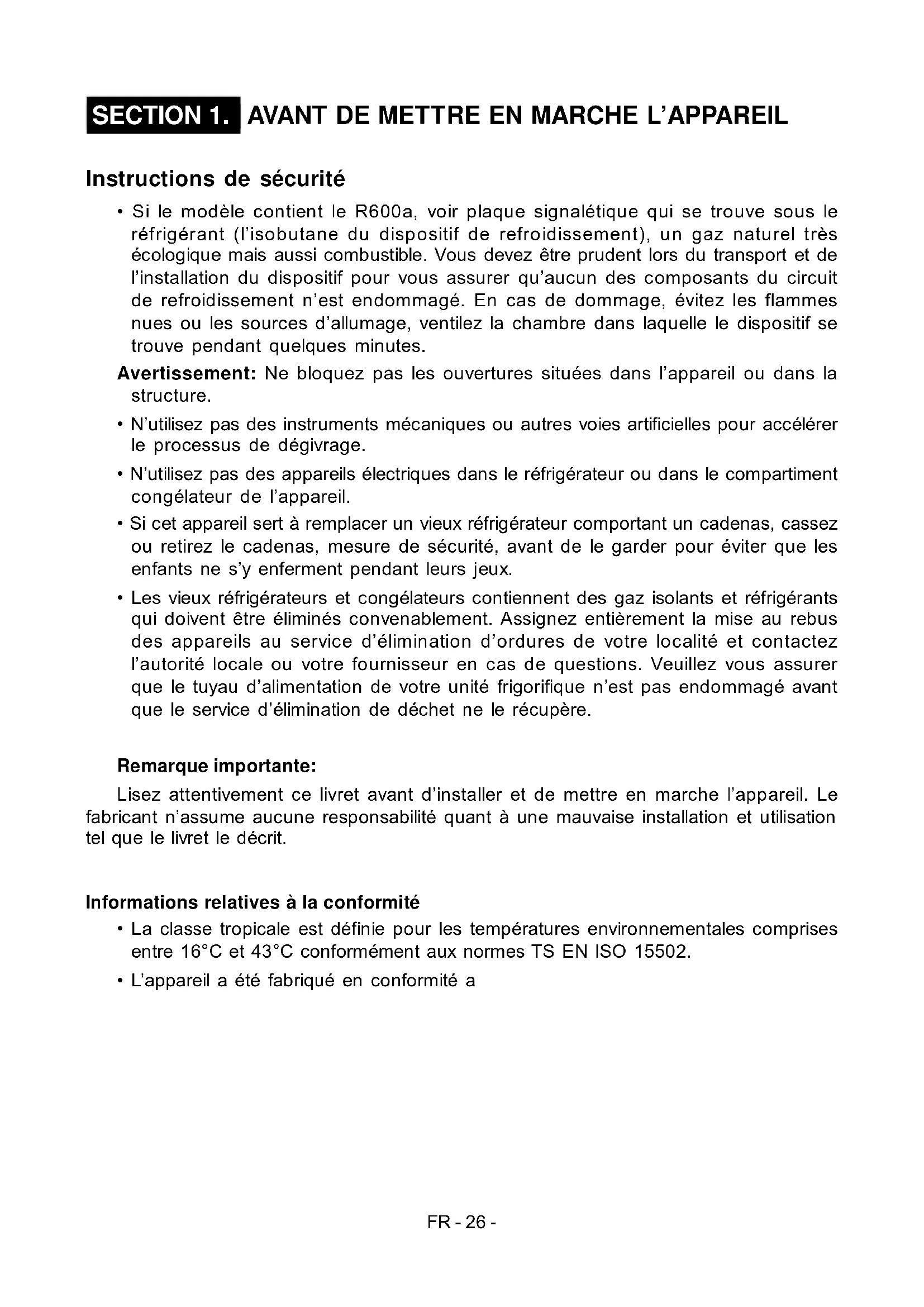 - Les vieux réfrigérateurs et congélateurs contiennent des gaz isolants et réfrigérants qui doivent être éliminés convenablement. Assignez entièrement la mise au rebus des appareils au service d’élimination d’ordures de votre localité et contactez l’autorité locale ou votre fournisseur en cas de questions. Veuillez vous assurer que le tuyau d’alimentation de votre unité frigorifique n’est pas endommagé avant que le service d’élimination de déchet ne le récupère. Remarque importante: Lisez attentivement ce livret avant d’installer et de mettre en marche l’appareil. Le fabricant n’assume aucune responsabilité quant à une mauvaise installation et utilisation tel que le livret le décrit. Informations relatives à la conformité