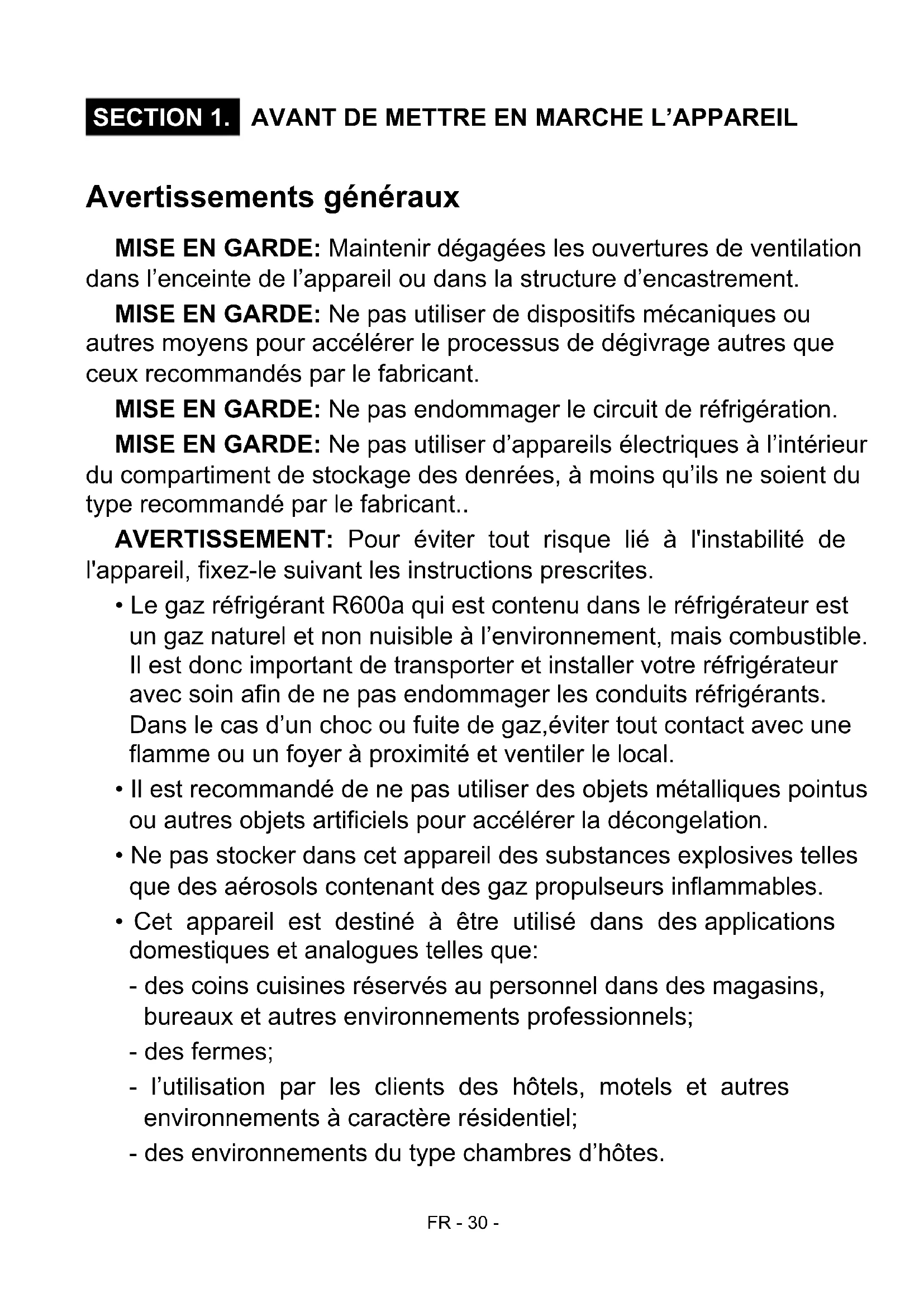 AVANT DE METTRE EN MARCHE L’APPAREIL Avertissements généraux MISE EN GARDE: Maintenir dégagées les ouvertures de ventilation dans l’enceinte de l’appareil ou dans la structure d’encastrement. MISE EN GARDE: Ne pas utiliser de dispositifs mécaniques ou autres moyens pour accélérer le processus de dégivrage autres que ceux recommandés par le fabricant. MISE EN GARDE: Ne pas endommager le circuit de réfrigération. MISE EN GARDE: Ne pas utiliser d’appareils électriques à l’intérieur du compartiment de stockage des denrées, à moins qu’ils ne soient du type recommandé par le fabricant..