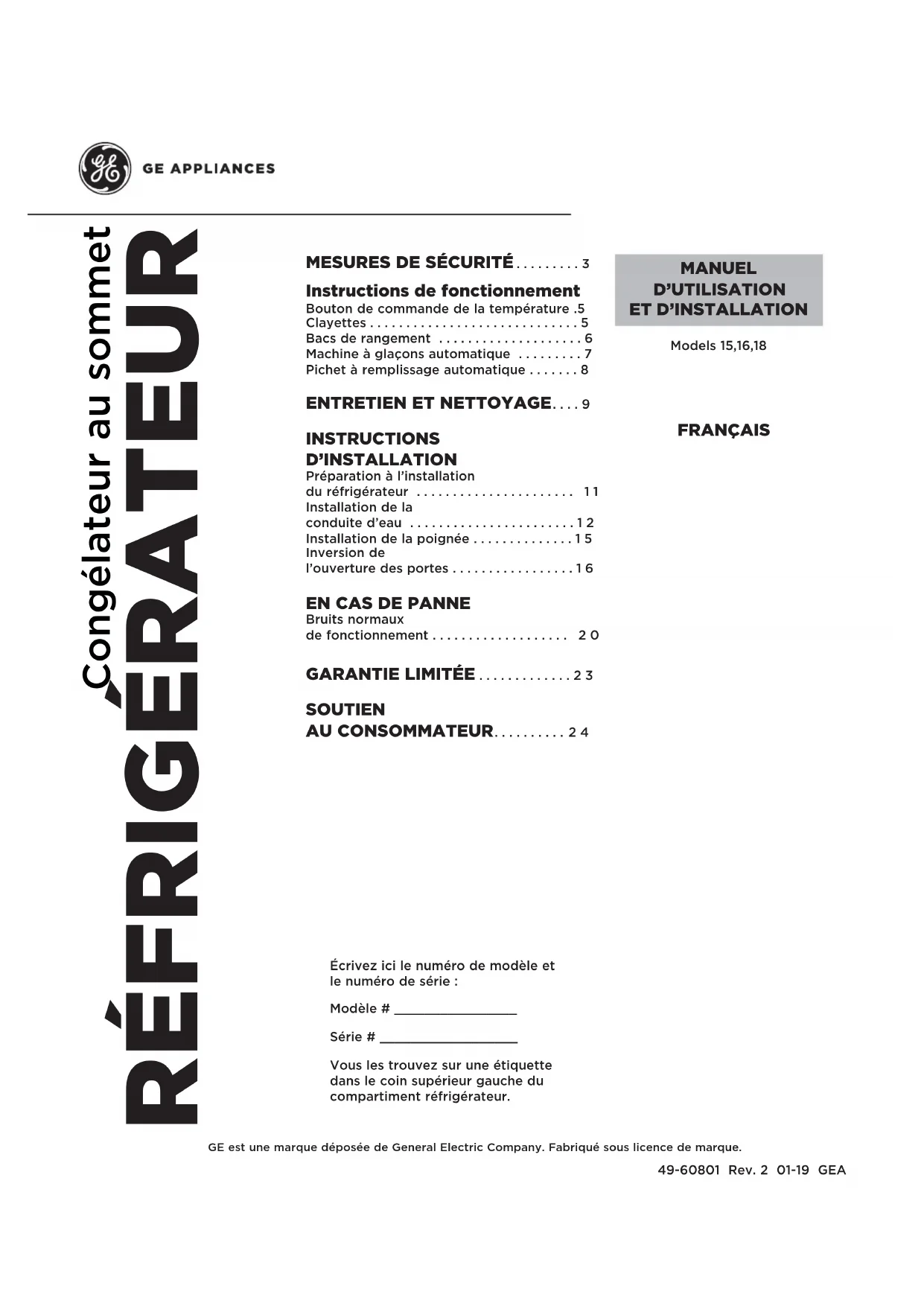 Congélateur au sommet2 49-60801 Rev. 2 NOUS VOUS REMERCIONS D’ACCUEILLIR GE APPLIANCES CHEZ VOUS Que vous ayez grandi avec GE Appliances ou qu’il s’agisse de votre première acquisition, nous sommes heureux de vous accueillir dans notre famille. Nous sommes fiers du savoir-faire, de l’innovation et de l’esthétique qui composent chaque appareil GE Appliances, et nous pensons que vous le serez aussi. Dans cette optique, nous vous rappelons que l’enregistrement de votre électroménager vous assure la communication de renseignements importants sur le produit et la garantie lorsque vous en avez besoin. Enregistrez votre électroménager GE en ligne dès maintenant. Des sites Web et des numéros de téléphone utiles figurent dans la section Soutien au consommateur de ce manuel d’utilisation. Vous pouvez aussi poster la fiche de garantie pré-imprimée incluse dans l’emballage.49-60801 Rev. 2 3