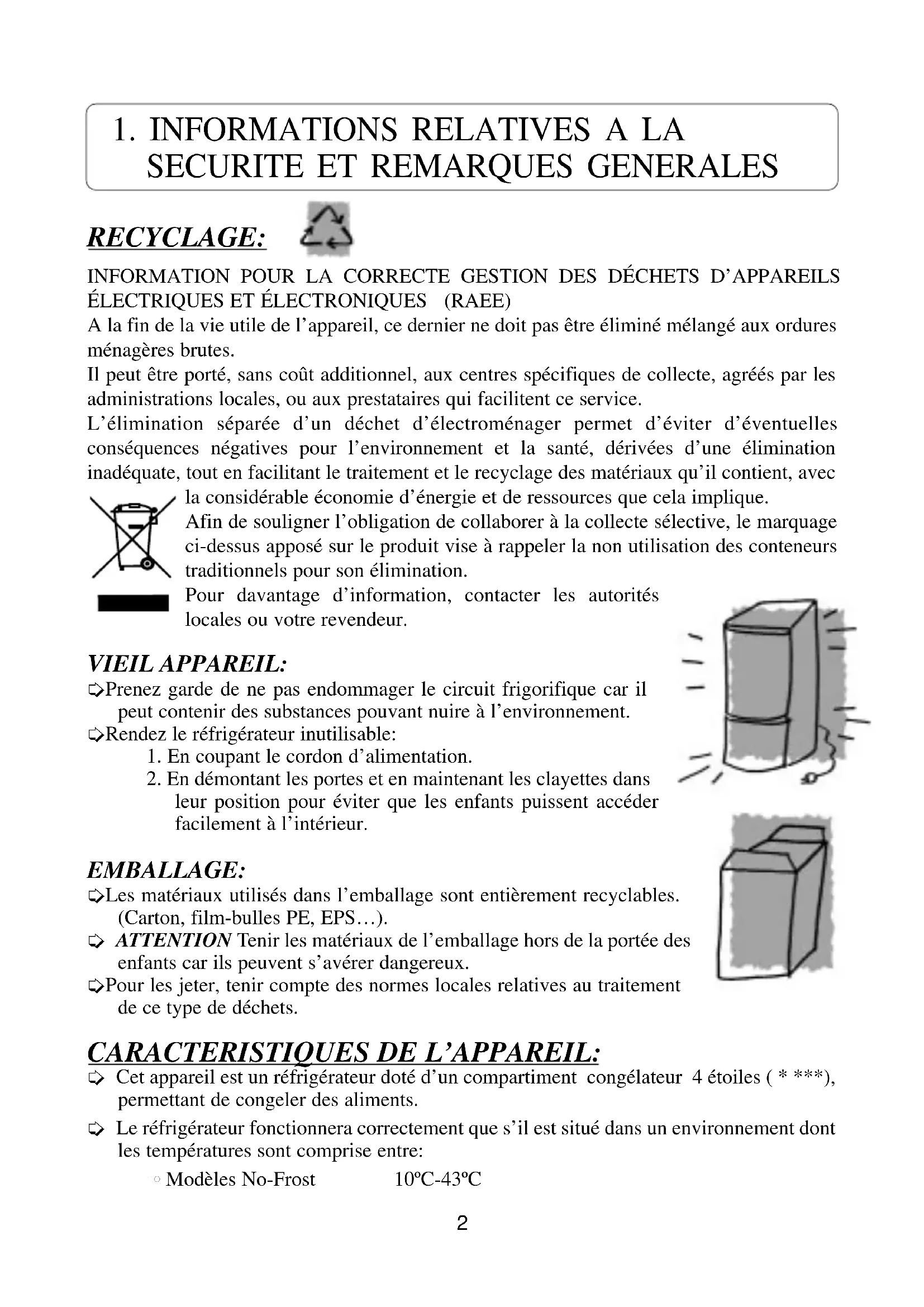 leur position pour éviter que les enfants puissent accéder facilement à l’intérieur. EMBALLAGE: ➭ Les matériaux utilisés dans l’emballage sont entièrement recyclables. (Carton, film-bulles PE, EPS…). ➭ ATTENTION Tenir les matériaux de l’emballage hors de la portée des enfants car ils peuvent s’avérer dangereux. ➭ Pour les jeter, tenir compte des normes locales relatives au traitement de ce type de déchets. CARACTERISTIQUES DE L’APPAREIL: ➭ Cet appareil est un réfrigérateur doté d’un compartiment congélateur 4 étoiles ( * ***), permettant de congeler des aliments. ➭ Le réfrigérateur fonctionnera correctement que s’il est situé dans un environnement dont les températures sont comprise entre: