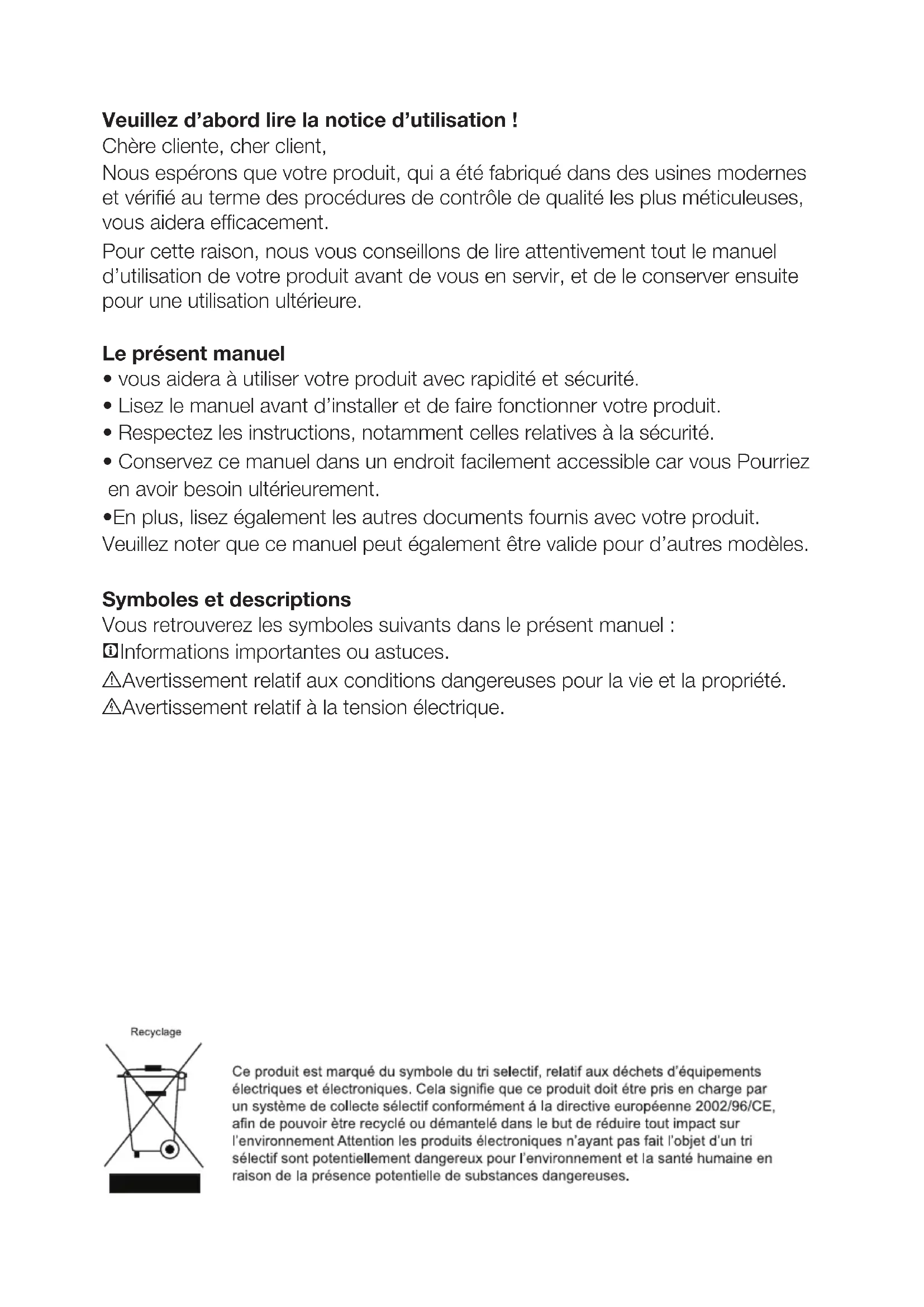 - Conservez ce manuel dans un endroit facilement accessible car vous Pourriez en avoir besoin ultérieurement.