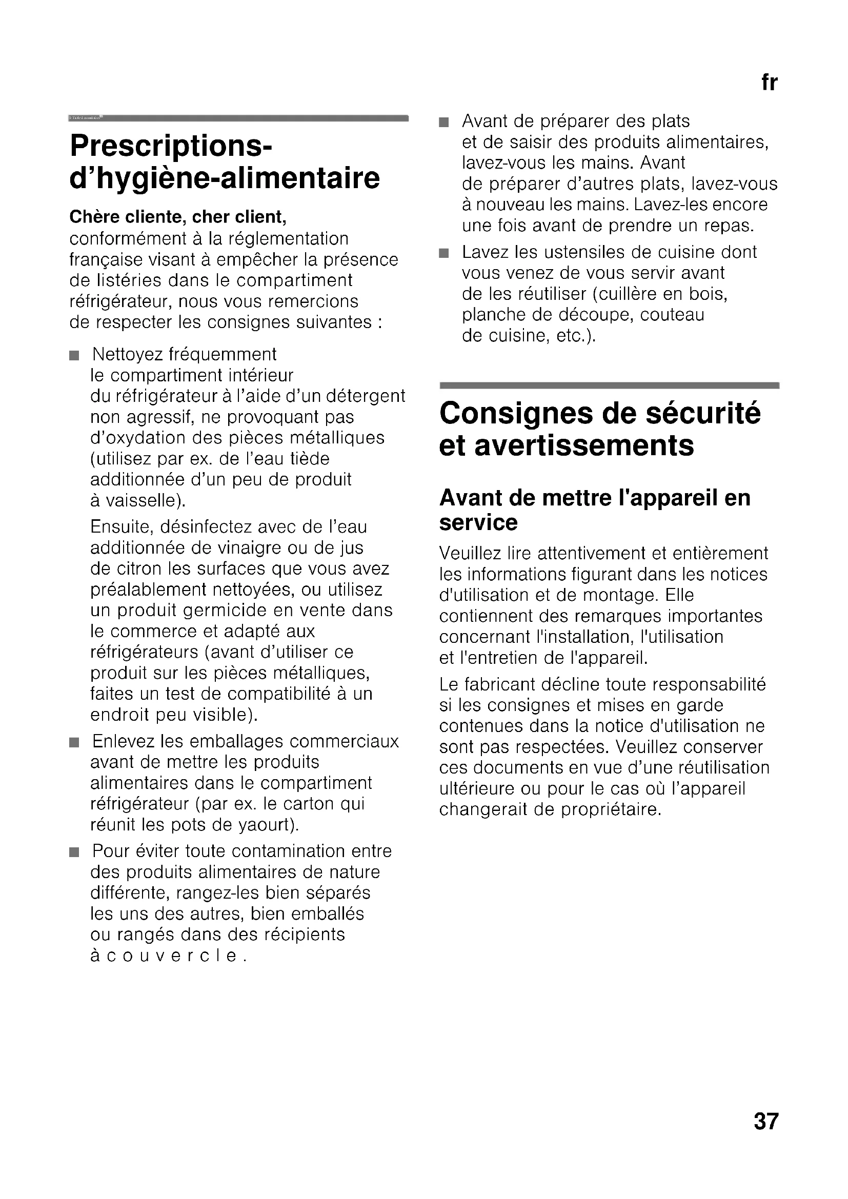 fr Table d es mat ières frMode d’emploi Prescriptions- d’hygiène-alimentaire Chère cliente, cher client, conformément à la réglementation française visant à empêcher la présence de listéries dans le compartiment réfrigérateur, nous vous remercions de respecter les consignes suivantes : ■ Nettoyez fréquemment le compartiment intérieur du réfrigérateur à l’aide d’un détergent non agressif, ne provoquant pas d’oxydation des pièces métalliques (utilisez par ex. de l’eau tiède additionnée d’un peu de produit à vaisselle). Ensuite, désinfectez avec de l’eau additionnée de vinaigre ou de jus de citron les surfaces que vous avez préalablement nettoyées, ou utilisez un produit germicide en vente dans le commerce et adapté aux réfrigérateurs (avant d’utiliser ce produit sur les pièces métalliques, faites un test de compatibilité à un endroit peu visible). ■ Enlevez les emballages commerciaux avant de mettre les produits alimentaires dans le compartiment réfrigérateur (par ex. le carton qui réunit les pots de yaourt). ■ Pour éviter toute contamination entre des produits alimentaires de nature différente, rangez-les bien séparés les uns des autres, bien emballés ou rangés dans des récipients àcouvercle. ■ Avant de préparer des plats et de saisir des produits alimentaires, lavez-vous les mains. Avant de préparer d’autres plats, lavez-vous à nouveau les mains. Lavez-les encore une fois avant de prendre un repas. ■ Lavez les ustensiles de cuisine dont vous venez de vous servir avant de les réutiliser (cuillère en bois, planche de découpe, couteau de cuisine, etc.). Consignes de sécurité et avertissements Avant de mettre l'appareil en service Veuillez lire attentivement et entièrement les informations figurant dans les notices d'utilisation et de montage. Elle contiennent des remarques importantes concernant l'installation, l'utilisation et l'entretien de l'appareil. Le fabricant décline toute responsabilité si les consignes et mises en garde contenues dans la notice d'utilisation ne sont pas respectées. Veuillez conserver ces documents en vue d’une réutilisation ultérieure ou pour le cas où l’appareil changerait de propriétaire.fr