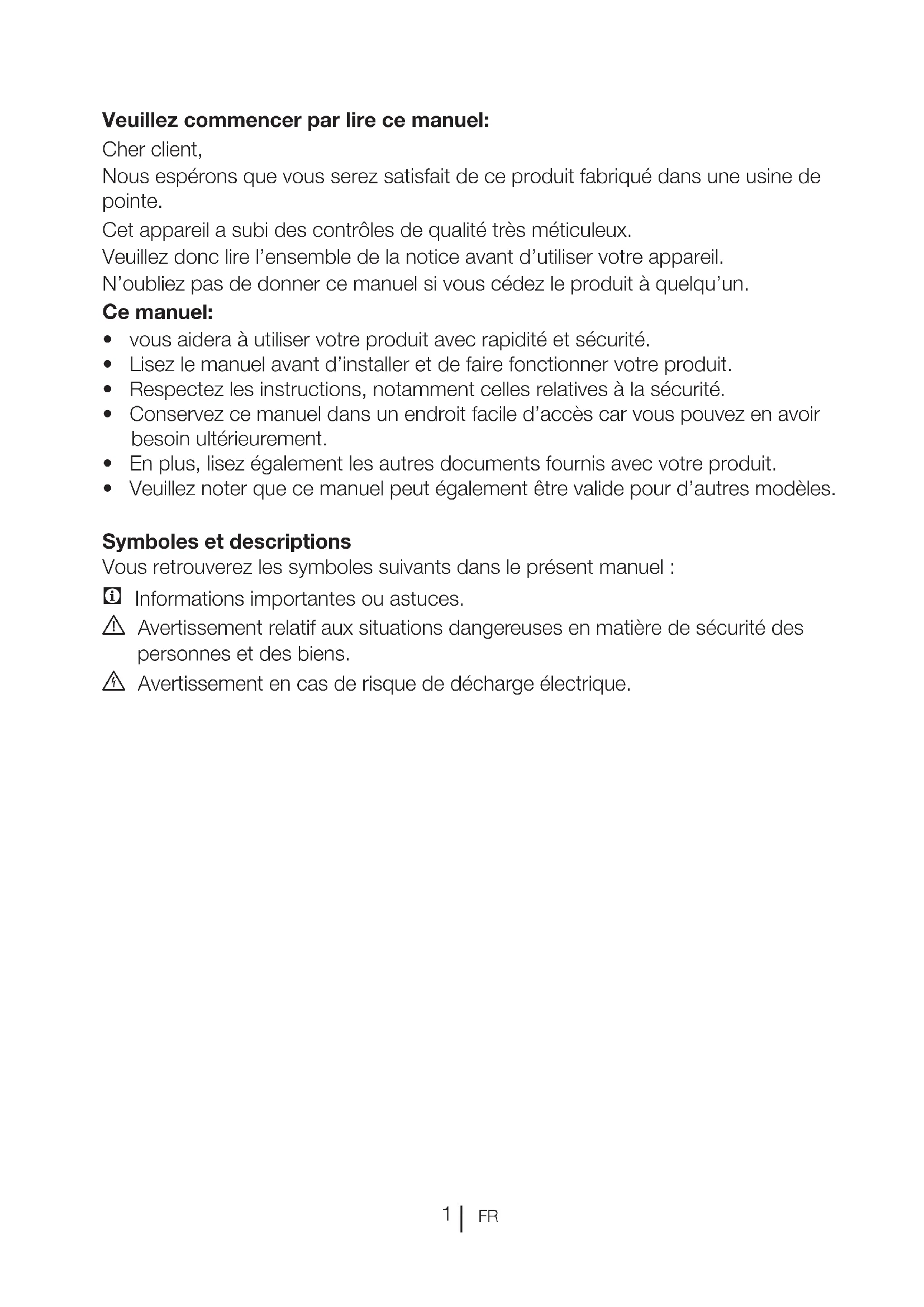 Veuillez commencer par lire ce manuel: Cher client, Nous espérons que vous serez satisfait de ce produit fabriqué dans une usine de pointe. Cet appareil a subi des contrôles de qualité très méticuleux. Veuillez donc lire l’ensemble de la notice avant d’utiliser votre appareil. N’oubliez pas de donner ce manuel si vous cédez le produit à quelqu’un. Ce manuel: