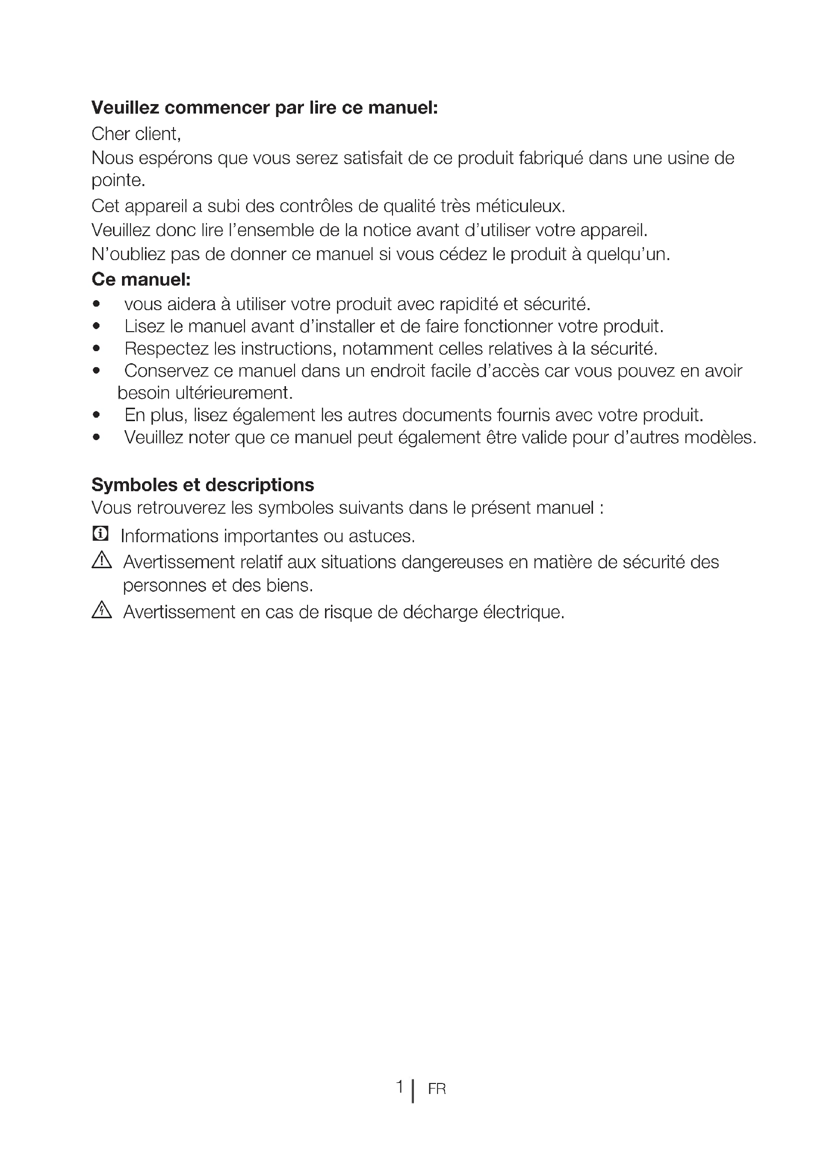 Veuillez commencer par lire ce manuel: Cher client, Nous espérons que vous serez satisfait de ce produit fabriqué dans une usine de pointe. Cet appareil a subi des contrôles de qualité très méticuleux. Veuillez donc lire l’ensemble de la notice avant d’utiliser votre appareil. N’oubliez pas de donner ce manuel si vous cédez le produit à quelqu’un. Ce manuel: