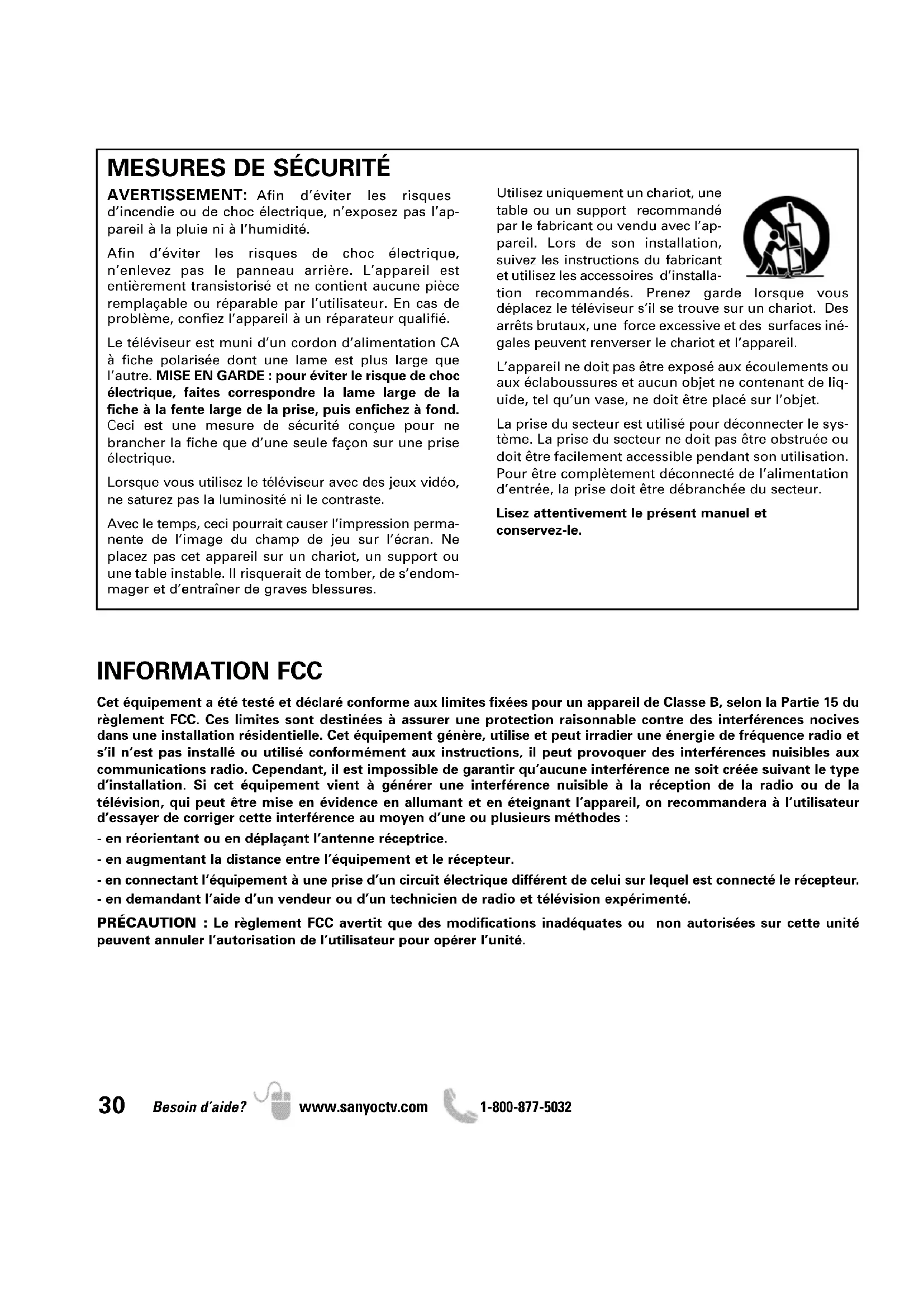 Placez vore HDTV hors de la portée des jeunes enfants pour éviter des accidents.33 Besoin d’aide? www.sanyoctv.com 1-800-877-5032