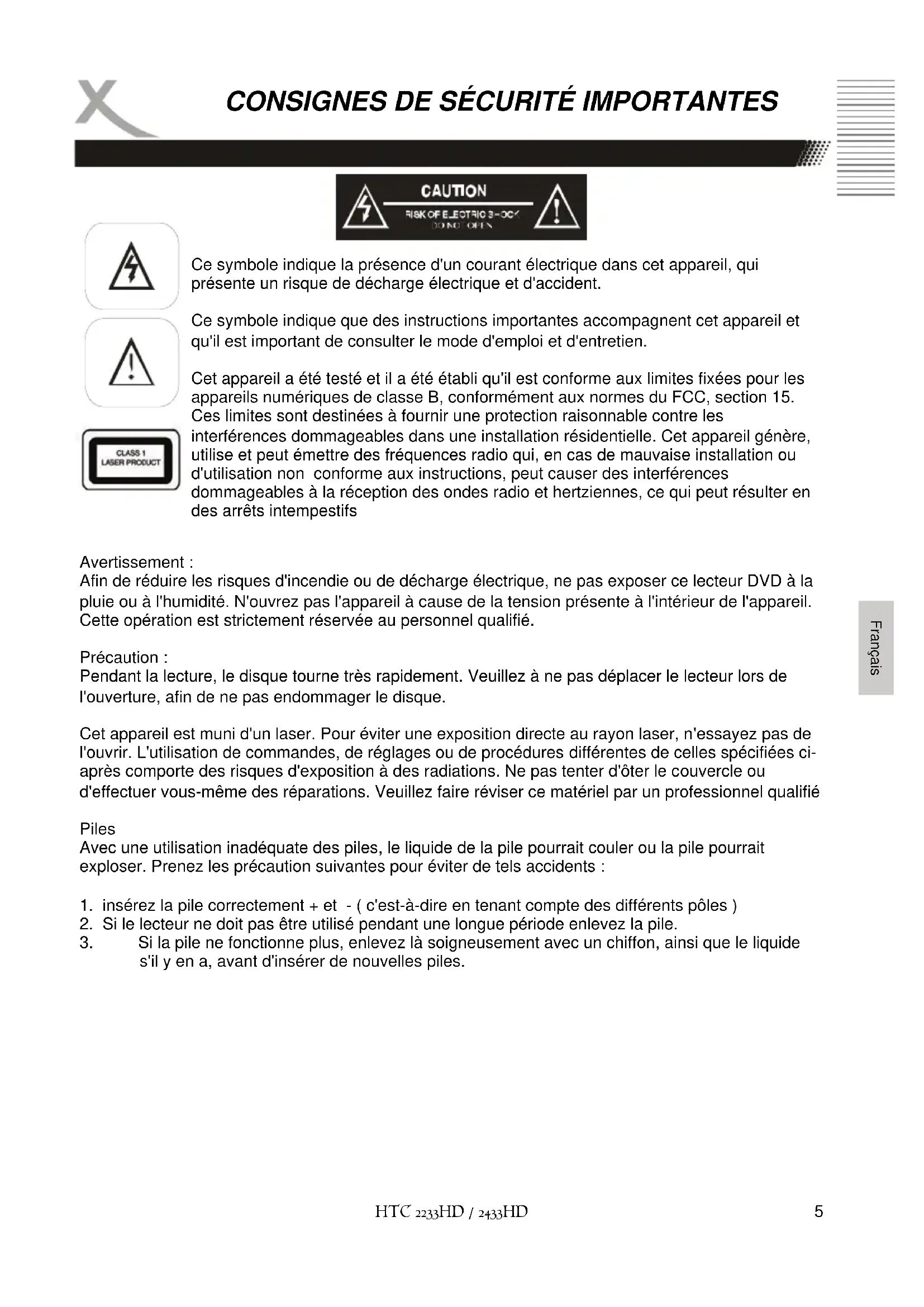 Afin de réduire les risques d'incendie ou de décharge électrique, ne pas exposer ce lecteur DVD à la pluie ou à l'humidité. N'ouvrez pas l'appareil à cause de la tension présente à l'intérieur de l'appareil. Cette opération est strictement réservée au personnel qualifié. Précaution : Pendant la lecture, le disque tourne très rapidement. Veuillez à ne pas déplacer le lecteur lors de l'ouverture, afin de ne pas endommager le disque. Cet appareil est muni d'un laser. Pour éviter une exposition directe au rayon laser, n'essayez pas de l'ouvrir. L'utilisation de commandes, de réglages ou de procédures différentes de celles spécifiées ci- après comporte des risques d'exposition à des radiations. Ne pas tenter d'ôter le couvercle ou d'effectuer vous-même des réparations. Veuillez faire réviser ce matériel par un professionnel qualifié Piles Avec une utilisation inadéquate des piles, le liquide de la pile pourrait couler ou la pile pourrait exploser. Prenez les précaution suivantes pour éviter de tels accidents :