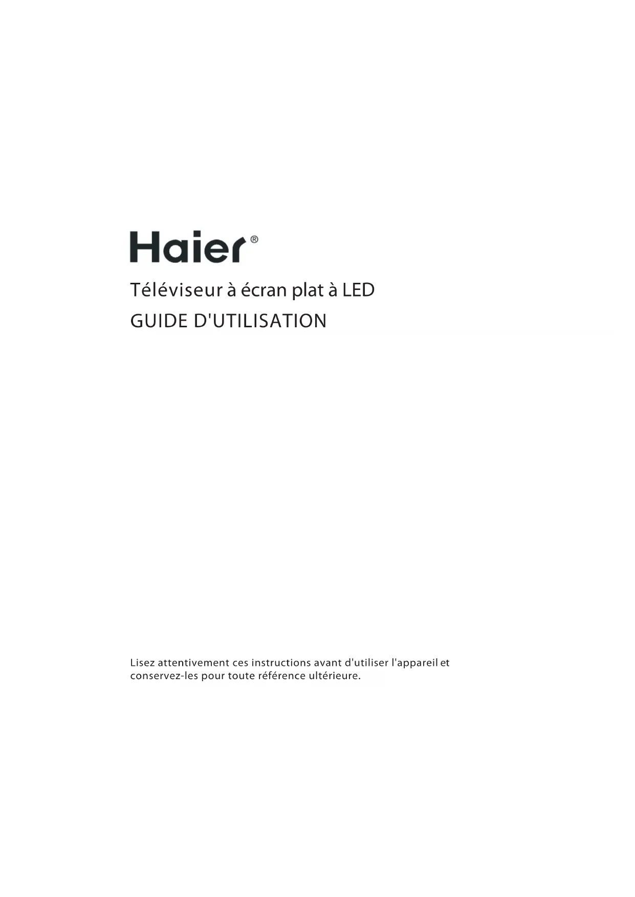 Pour obtenir des performances optimales, consultez attentivement le présent mode d'emploi, puis rangez-le dans un endroit facilement accessible pour pouvoir vous y reporter ultérieurement. Les chiffres et les données communiqués au sujet de l'écran dans le présent mode d'emploi peuvent, suite aux innovations technologiques apportées, ne pas correspondre tout à fait aux caractéristiques de votre modèle.Tout démontage, sans approbation préalable, du présent produit est strictement interdit, elle entrainerait l'annulation de la garantie Haier.