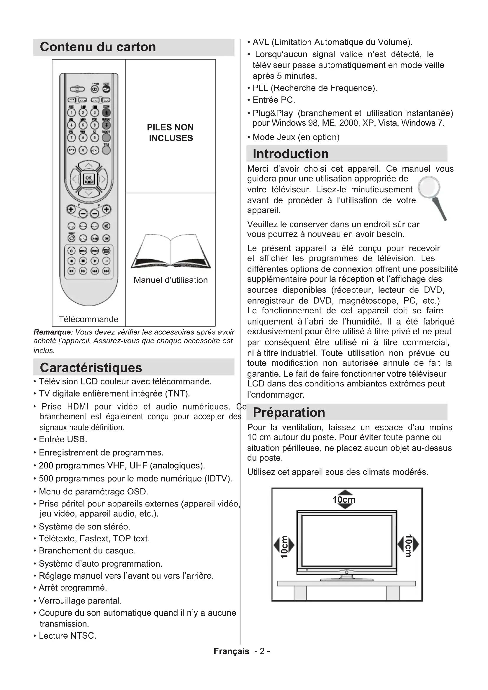 - Mode Jeux (en option) Introduction Merci d’avoir choisi cet appareil. Ce manuel vous guidera pour une utilisation appropriée de votre téléviseur. Lisez-le minutieusement avant de procéder à l’utilisation de votre appareil. Veuillez le conserver dans un endroit sûr car vous pourrez à nouveau en avoir besoin. Le présent appareil a été conçu pour recevoir et afficher les programmes de télévision. Les différentes options de connexion offrent une possibilité supplémentaire pour la réception et l’afchage des sources disponibles (récepteur, lecteur de DVD, enregistreur de DVD, magnétoscope, PC, etc.) Le fonctionnement de cet appareil doit se faire uniquement à l’abri de l’humidité. Il a été fabriqué exclusivement pour être utilisé à titre privé et ne peut par conséquent être utilisé ni à titre commercial, ni à titre industriel. Toute utilisation non prévue ou toute modication non autorisée annule de fait la garantie. Le fait de faire fonctionner votre téléviseur LCD dans des conditions ambiantes extrêmes peut l’endommager. Préparation Pour la ventilation, laissez un espace d’au moins 10 cm autour du poste. Pour éviter toute panne ou situation périlleuse, ne placez aucun objet au-dessus du poste. Utilisez cet appareil sous des climats modérés. 10 cm 10 cm 10 cm MENU