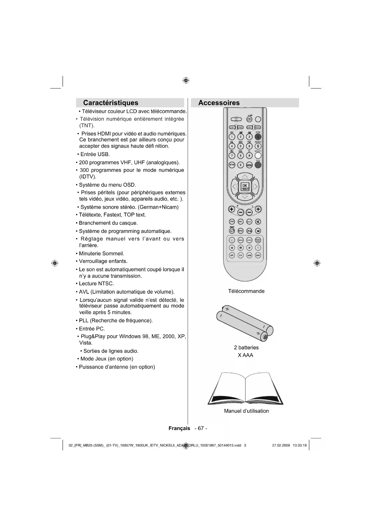 - SVCD stands for “Super Video CD”. ASVCD is very sim iliar to a VC D. It is en-coded by MPEG-2 and it has higher videoquality than VCD. Disc Types Compatible with This Unit This player can play the following discs. 01_[GB]_MB25_ (02-DVD)_16857W_1900UK_IDTV_NICKEL5_DIVX_10061867_50144013.indd 1901_[GB]_MB25_ (02-DVD)_16857W_1900UK_IDTV_NICKEL5_DIVX_10061867_50144013.indd 19 27.02.2009 13:32:3627.02.2009 13:32:36English - 64 - Specifi cations DVD / VCD / CD / CD-R / CD-RW / MP3 / JPEG / MPEG / DivX player, Types of Discs Supported DVD: SS/SL 4.7” (DVD-5) SS/DL 4.7” (DVD-9) DS/SL 4.7” (DVD-10) DS/DL 4.7” (DVD-18) VCD/SVCD CD-DA CD-R CD-RW MP-3/JPEG Video Type MPEG-2 Video Standard Decoding (MPEG-1 supported) Full-Screen Video Display of 720 x 576 (PAL) & 720 x 480 (NTSC) pixels 50 and 60 Hz frame refresh rates (PAL & NTSC) Digital bit-stream processing rate up to 108Mbits/sec Line resolution more than 500 lines Audio Type Dolby Digital Decoding MPEG Multichannel Decoding LPCM Audio Output Digital Audio Outputs: IEC 958 TOSLINK Analog Outputs: 24 bit /48, 44.1kHz down-sampling DAC 01_[GB]_MB25_ (02-DVD)_16857W_1900UK_IDTV_NICKEL5_DIVX_10061867_50144013.indd 2001_[GB]_MB25_ (02-DVD)_16857W_1900UK_IDTV_NICKEL5_DIVX_10061867_50144013.indd 20 27.02.2009 13:32:3627.02.2009 13:32:36Français - 65 - Table des matières Caractéristiques p. 67