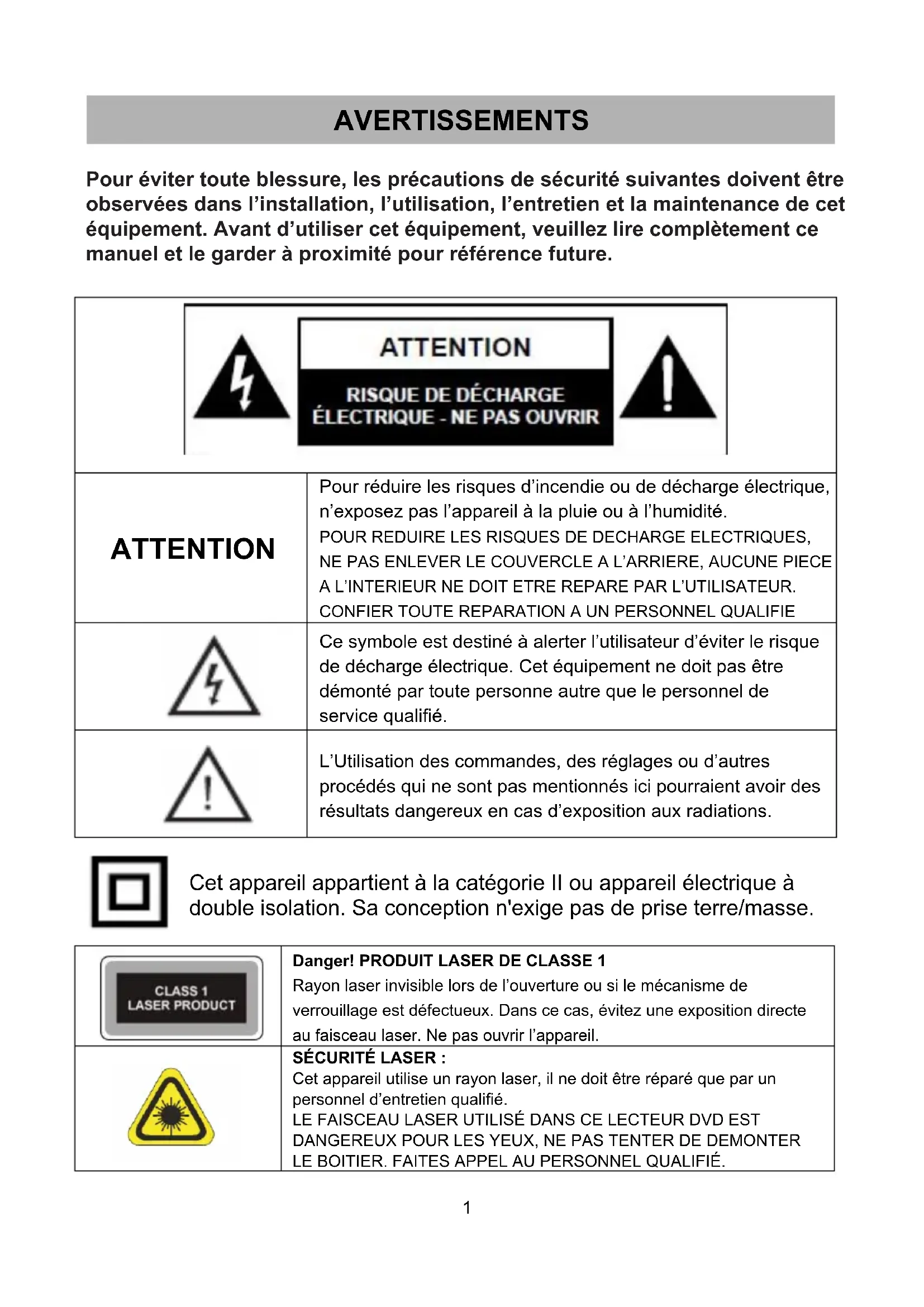 SÉCURITÉ LASER : Cet appareil utilise un rayon laser, il ne doit être réparé que par un personnel d’entretien qualifié. LE FAISCEAU LASER UTILISÉ DANS CE LECTEUR DVD EST DANGEREUX POUR LES YEUX, NE PAS TENTER DE DEMONTER LE BOITIER. FAITES APPEL AU PERSONNEL QUALIFIÉ. AVERTISSEMENTS2