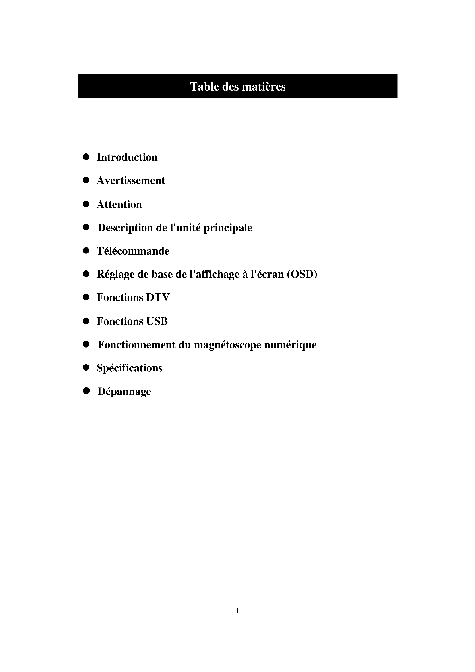 Introduction Avertissement Attention Description de l'unité principale Télécommande Réglage de base de l'affichage à l'écran (OSD) Fonctions DTV Fonctions USB Fonctionnement du magnétoscope numérique Spécifications Dépannage2 Introduction