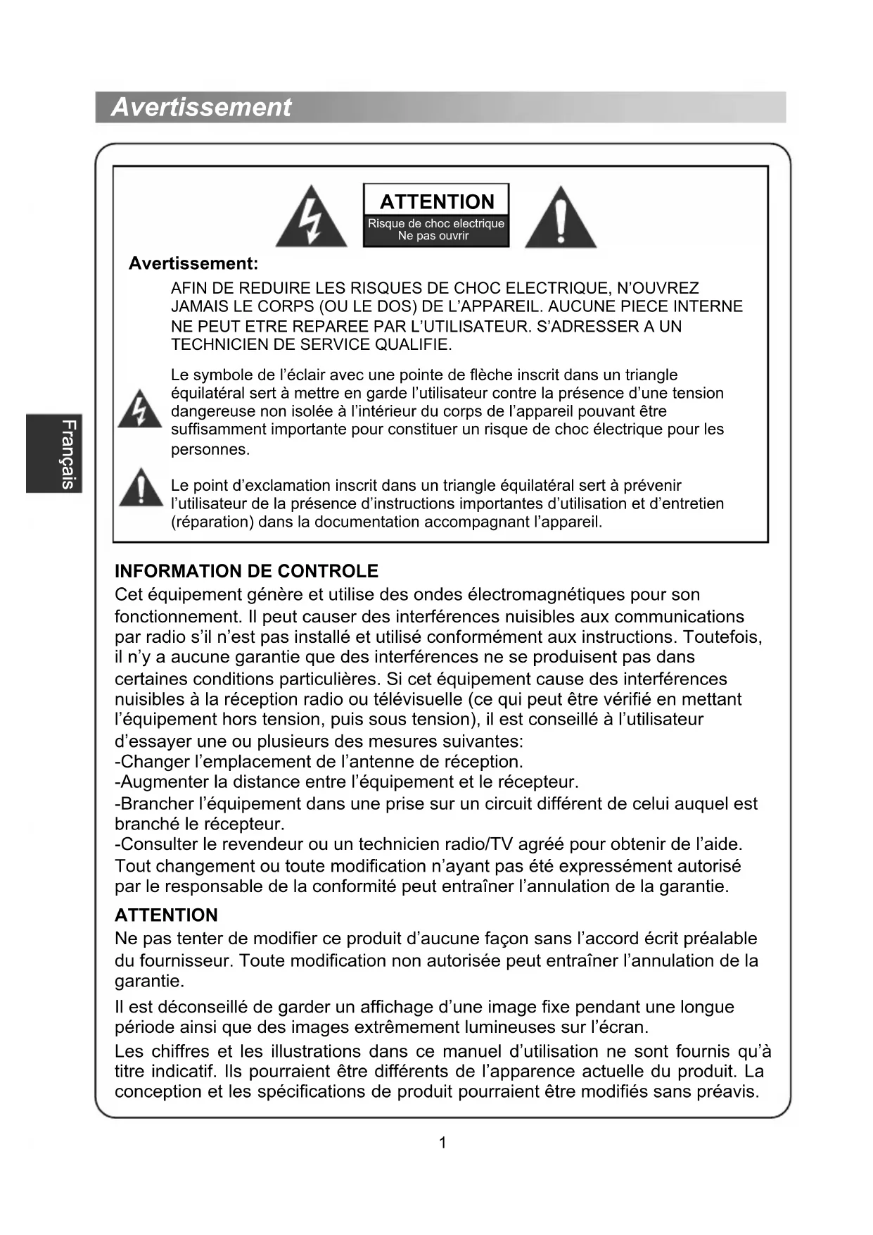 AFIN DE REDUIRE LES RISQUES DE CHOC ELECTRIQUE, N'OUVREZ JAMAIS LE CORPS (OU LE DOS) DE L'APPAREIL. AUCUNE PIECE INTERNE NE PEUT ETRE REPAREE PAR L'UTILISATEUR. S'ADRESSER A UN TECHNICIEN DE SERVICE QUALIFIE.