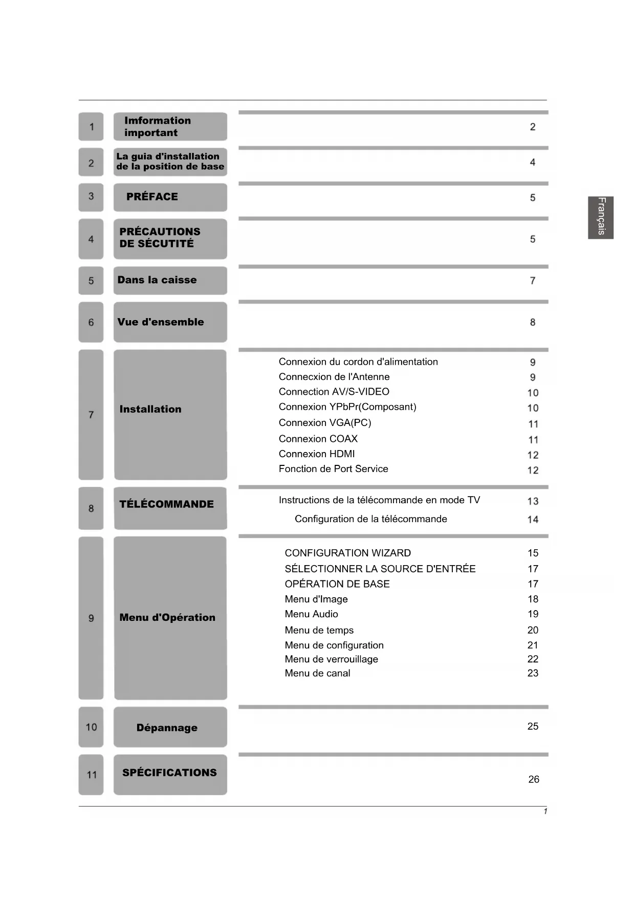 Menu d'Opération Dépannage SPÉCIFICATIONS Instructions de la télécommande en mode TV Configuration de la télécommande CONFIGURATION WIZARD
