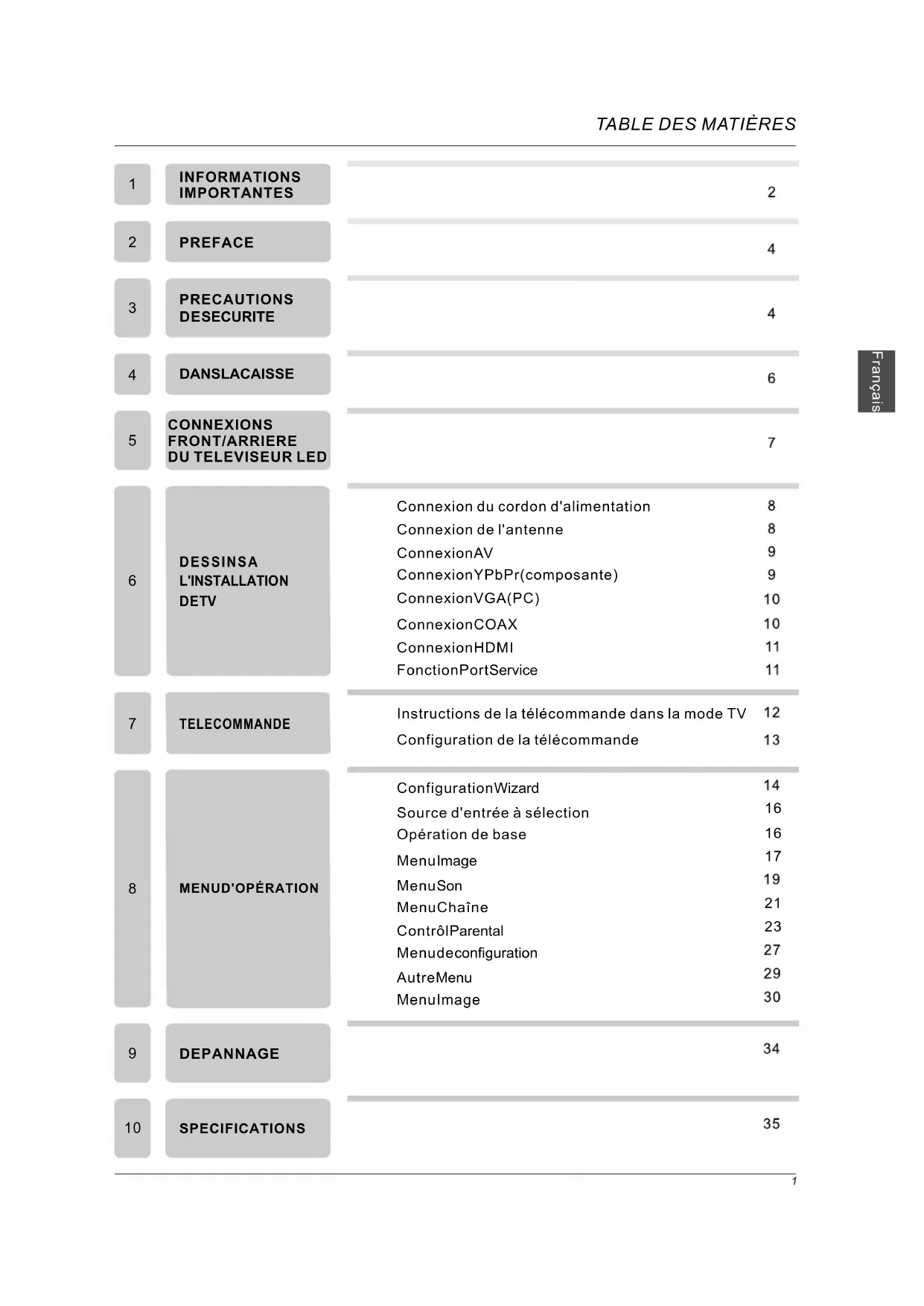 | 5 | CONNEXIONS FRONT/ARRIERE DU TELEVISEUR LED | 7 | |