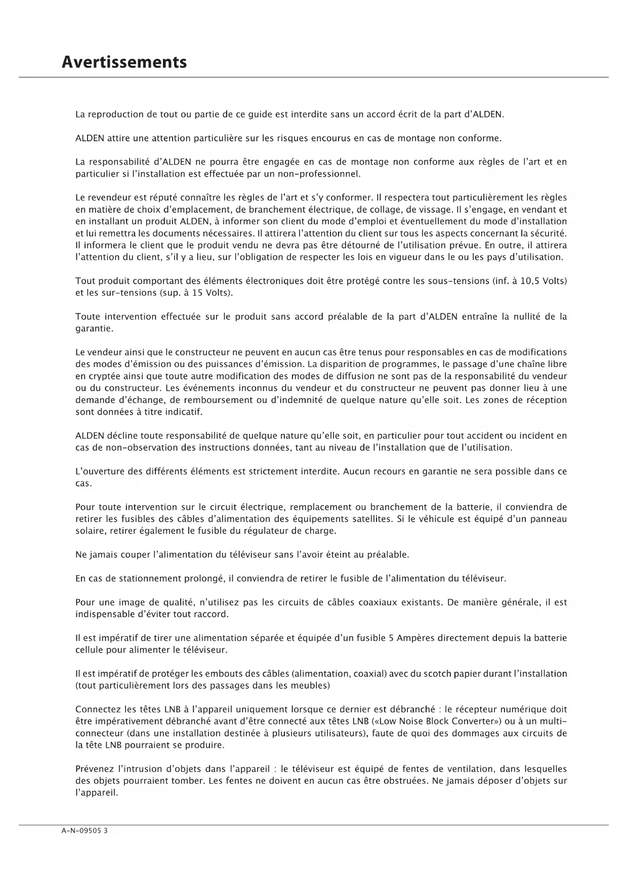 TV 16:9 • TV 16:9 combo DVD Guide d’installation et d’utilisation Installation and user’s guide Aufbau- und Bedienungsanleitung 110420A-N-09505 Z.A. du Hairy F-67230 HUTTENHEIM www.alden.fr modèles déposés - photos non contractuelles - document établi sous réserve de modifications techniques Register pattern - Design and specifications are subject to change without notice Eingetragenes Warenzeichen - Photos ohne Gewähr - Technische Änderungen vorbehalten LED SERIES BACKLIGHTA-N-095052 Sommaire • Contents • Inhaltsverzeichnis 03 Avertissements 05 Mise en place du pied du téléviseur 06 Éléments de contrôle et connectique 07 Préparation et utilisation de la télécommande 08 Descriptif et fonctions de la télécommande 08 En mode TV 09 En mode Télétexte 09 En mode DVD 10 Utilisation 10 Première mise sous tension 11 Utilisation de la source MEDIA 12 Utilisation de la fonction ENREGISTREMENT 13 Fonctions avancées du téléviseur 13 Menu Image 14 Menu Audio 15 Menu Fonction 16 Menu TV 17 Menu DTV 18 Menu PC 19 Menu HDMI / YPbPr 19 Que faire en cas de panne 20 Caractéristiques techniques 21 Garantie 22 Bon de garantie 23 Warnings 25 How to install the TV foot 26 Description of the main unit 27 How to install and use the remote control 28 Description and functions of the remore control 28 in TV mode 29 in Text mode 29 in DVD mode 30 How to use 30 First use 31 How to use the MEDIA source 32 How to use the PVR function 33 Advanced functions to the TV 33 Picture menu 34 Sound menu 35 Functions menu 36 TV menu 37 DTV menu 38 Computer menu 39 HDMI / YPbPr menu 39 What to do in case of breakdown 40 Technical specifications 41 Alden warranty 42 Warranty form 43 Wichtige Hinweise 45 Vorbereitung des Fernsehers 46 Beschreibung 47 Benutzung der Fernbedienung 48 Beschreibung und Funktionen der Fernbedienung 48 im TV-Modus 49 im Teletext-Modus 49 im DVD-Modus 50 Benutzung 50 Erste Benutzung 51 des Media-Eingangs 52 der PVR-Funktion 53 Weitere Funktion des Fersehers 53 Bild-Menü 54 Ton-Menü 55 Funktionen-Menü 56 TV-Menü 57 DTV-Menü 58 PC-Menü 59 HDMI- YPbPr-Menü 59 Störungsbehebung 60 Technische Daten 61 Alden-Garantie 62 Garantiekarte Français English DeutschA-N-09505 3 Avertissements La reproduction de tout ou partie de ce guide est interdite sans un accord écrit de la part dʼALDEN. ALDEN attire une attention particulière sur les risques encourus en cas de montage non conforme. La responsabilité dʼALDEN ne pourra être engagée en cas de montage non conforme aux règles de lʼart et en particulier si lʼinstallation est effectuée par un non-professionnel. Le revendeur est réputé connaître les règles de lʼart et sʼy conformer. Il respectera tout particulièrement les règles en matière de choix dʼemplacement, de branchement électrique, de collage, de vissage. Il sʼengage, en vendant et en installant un produit ALDEN, à informer son client du mode dʼemploi et éventuellement du mode dʼinstallation et lui remettra les documents nécessaires. Il attirera lʼattention du client sur tous les aspects concernant la sécurité. Il informera le client que le produit vendu ne devra pas être détourné de lʼutilisation prévue. En outre, il attirera lʼattention du client, sʼil y a lieu, sur lʼobligation de respecter les lois en vigueur dans le ou les pays dʼutilisation. Tout produit comportant des éléments électroniques doit être protégé contre les sous-tensions (inf. à 10,5 Volts) et les sur-tensions (sup. à 15 Volts). Toute intervention effectuée sur le produit sans accord préalable de la part dʼALDEN entraîne la nullité de la garantie. Le vendeur ainsi que le constructeur ne peuvent en aucun cas être tenus pour responsables en cas de modifications des modes dʼémission ou des puissances dʼémission. La disparition de programmes, le passage dʼune chaîne libre en cryptée ainsi que toute autre modification des modes de diffusion ne sont pas de la responsabilité du vendeur ou du constructeur. Les événements inconnus du vendeur et du constructeur ne peuvent pas donner lieu à une demande dʼéchange, de remboursement ou dʼindemnité de quelque nature quʼelle soit. Les zones de réception sont données à titre indicatif. ALDEN décline toute responsabilité de quelque nature quʼelle soit, en particulier pour tout accident ou incident en cas de non-observation des instructions données, tant au niveau de lʼinstallation que de lʼutilisation. Lʼouverture des différents éléments est strictement interdite. Aucun recours en garantie ne sera possible dans ce cas. Pour toute intervention sur le circuit électrique, remplacement ou branchement de la batterie, il conviendra de retirer les fusibles des câbles dʼalimentation des équipements satellites. Si le véhicule est équipé dʼun panneau solaire, retirer également le fusible du régulateur de charge. Ne jamais couper lʼalimentation du téléviseur sans lʼavoir éteint au préalable. En cas de stationnement prolongé, il conviendra de retirer le fusible de lʼalimentation du téléviseur. Pour une image de qualité, nʼutilisez pas les circuits de câbles coaxiaux existants. De manière générale, il est indispensable dʼéviter tout raccord. Il est impératif de tirer une alimentation séparée et équipée dʼun fusible 5 Ampères directement depuis la batterie cellule pour alimenter le téléviseur. Il est impératif de protéger les embouts des câbles (alimentation, coaxial) avec du scotch papier durant l ʼinstallation (tout particulièrement lors des passages dans les meubles) Connectez les têtes LNB à lʼappareil uniquement lorsque ce dernier est débranché : le récepteur numérique doit être impérativement débranché avant dʼêtre connecté aux têtes LNB («Low Noise Block Converter») ou à un multi- connecteur (dans une installation destinée à plusieurs utilisateurs), faute de quoi des dommages aux circuits de la tête LNB pourraient se produire. Préven