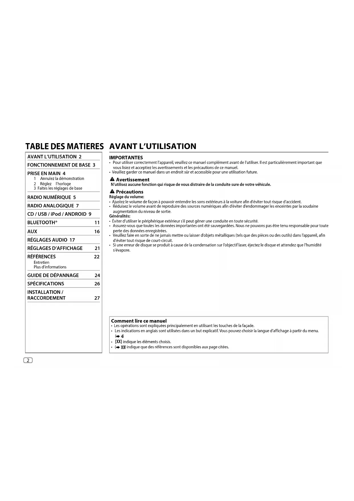 - Veuillez garder ce manuel dans un endroit sûr et accessible pour une utilisation future. Avertissement N’utilisez aucune fonction qui risque de vous distraire de la conduite sure de votre véhicule. Précautions Réglage du volume: