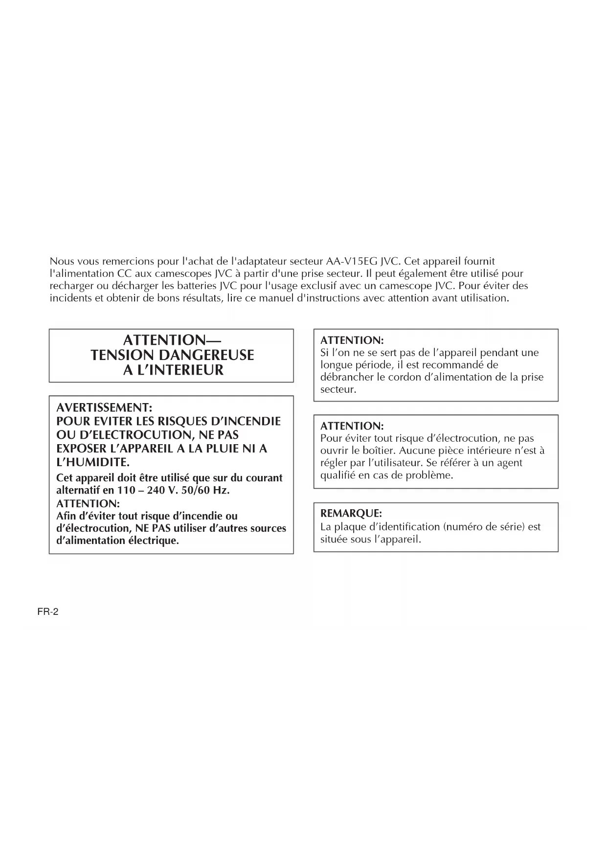 EXPOSER L’APPAREIL A LA PLUIE NI A L’HUMIDITE. Cet appareil doit être utilisé que sur du courant alternatif en 110 – 240 V. 50/60 Hz. ATTENTION: Afin d’éviter tout risque d’incendie ou d’électrocution, NE PAS utiliser d’autres sources d’alimentation électrique. ATTENTION: Pour éviter tout risque d’électrocution, ne pas ouvrir le boîtier. Aucune pièce intérieure n’est à régler par l’utilisateur. Se référer à un agent qualifié en cas de problème. REMARQUE: La plaque d’identification (numéro de série) est située sous l’appareil.FR-3 Comme adaptateur secteur/chargeur, le AA-V15EG est utilisé exclusivement avec les camescopes JVC.