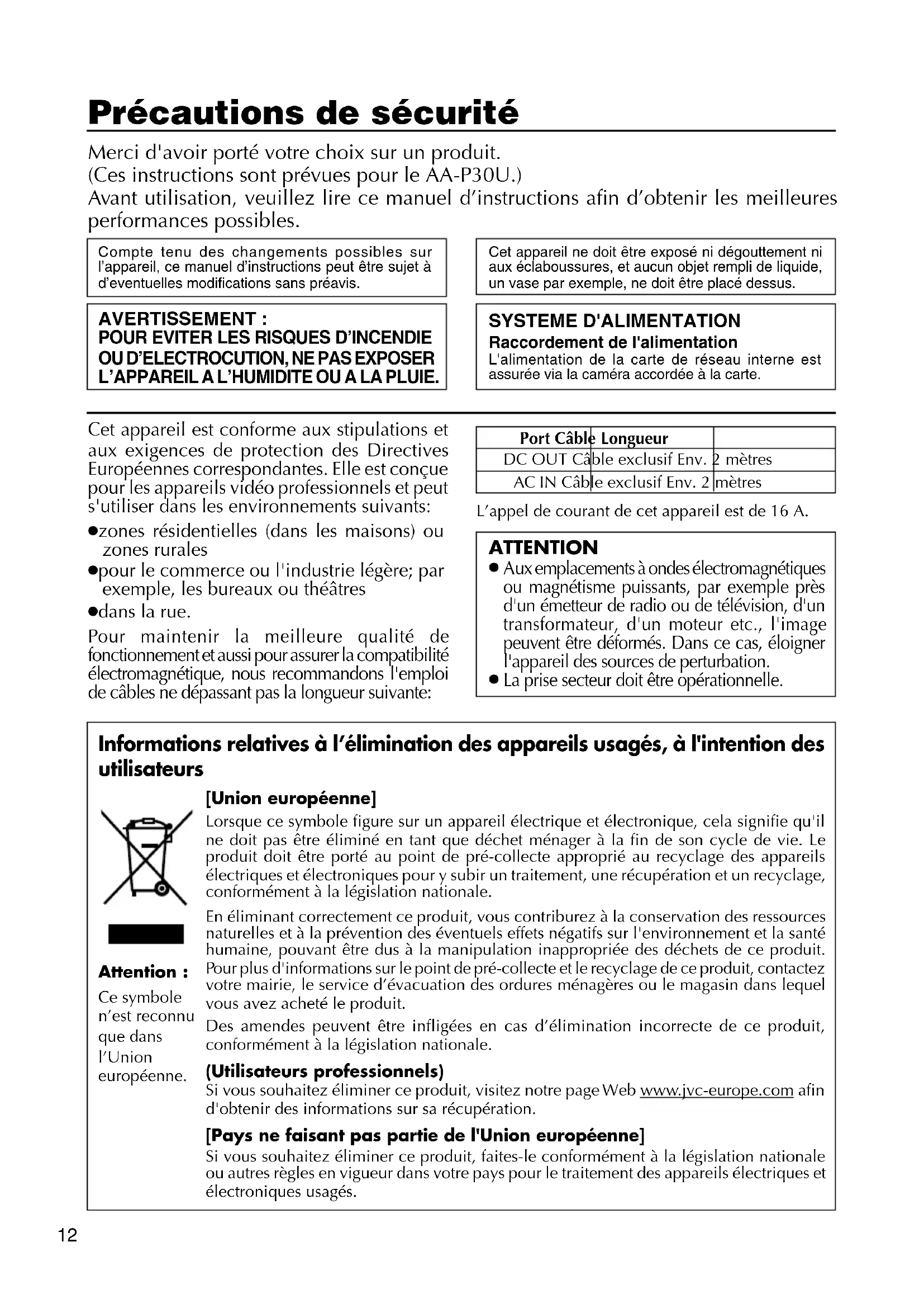 La prise secteur doit être opérationnelle. Cet appareil ne doit être exposé ni dégouttement ni aux éclaboussures, et aucun objet rempli de liquide, un vase par exemple, ne doit être placé dessus. Informations relatives à l’élimination des appareils usagés, à l'intention des utilisateurs [Union européenne] Lorsque ce symbole figure sur un appareil électrique et électronique, cela signifie qu'il ne doit pas être éliminé en tant que déchet ménager à la fin de son cycle de vie. Le produit doit être porté au point de pré-collecte approprié au recyclage des appareils électriques et électroniques pour y subir un traitement, une récupération et un recyclage, conformément à la législation nationale. En éliminant correctement ce produit, vous contriburez à la conservation des ressources naturelles et à la prévention des éventuels effets négatifs sur l'environnement et la santé humaine, pouvant être dus à la manipulation inappropriée des déchets de ce produit. Pour plus d'informations sur le point de pré-collecte et le recyclage de ce produit, contactez votre mairie, le service d’évacuation des ordures ménagères ou le magasin dans lequel vous avez acheté le produit. Des amendes peuvent être infligées en cas d’élimination incorrecte de ce produit, conformément à la législation nationale. (Utilisateurs professionnels) Si vous souhaitez éliminer ce produit, visitez notre page Web www.jvc-europe.com afin d'obtenir des informations sur sa récupération. [Pays ne faisant pas partie de l'Union européenne] Si vous souhaitez éliminer ce produit, faites-le conformément à la législation nationale ou autres règles en vigueur dans votre pays pour le traitement des appareils électriques et électroniques usagés. Attention : Ce symbole n’est reconnu que dans l’Union européenne.