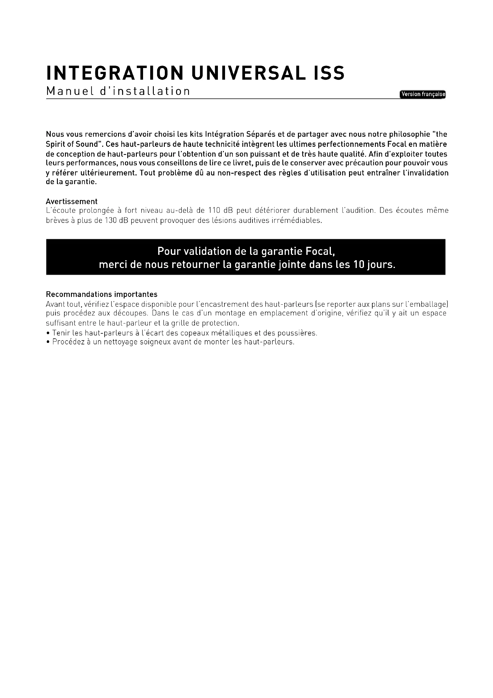 Nous you remercions d'avoir choisi les kits Integration Separés et de partager avec nous notre philosophie "the Spirit of Sound". Ces haut-parleurs de haute technicity integrent les ultimes perfectionnements Focal en matière de conception de haut-parleurs pour l'obtention d'un son puissant et de très haute qualite. Afin d'exploiter toutes leurs performances, nous vous conseillons de dire ce livre, puis de le conserver avec precaution pour pouvoir vous y referrer ulterieurement. Tout probleme du au non-respect des regles d'utilisation peut entrainer l'invalidation de la garantie.