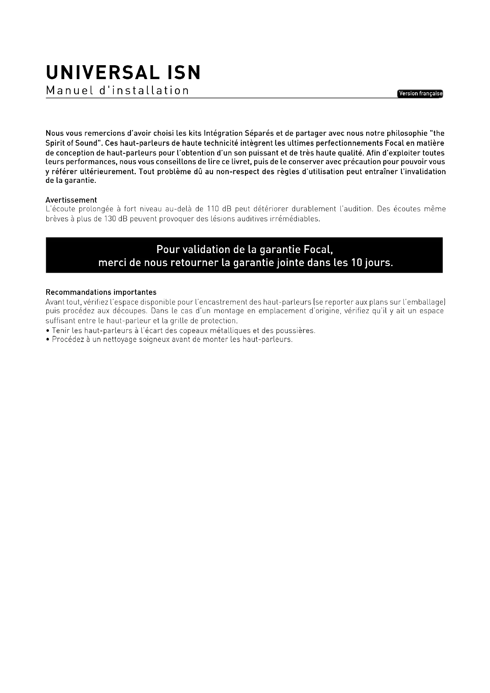 Nous you remercions d'avoir choisi les kits Integration Separés et de partager avec nous notre philosophie "the Spirit of Sound". Ces haut-parleurs de haute technicité intègrent les ultimes perfectionnements Focal en matière de conception de haut-parleurs pour l'obtention d'un son puissant et de très haute qualité. Afin d'exploiter toutes leurs performances, nous vous conseillons de dire ce livre, puis de le conserver avec précaution pour pouvoir vous y référer ultérieurement. Tout problème du au non-respect des règles d'utilisation peut entrainer l'invalidation de la garantie.