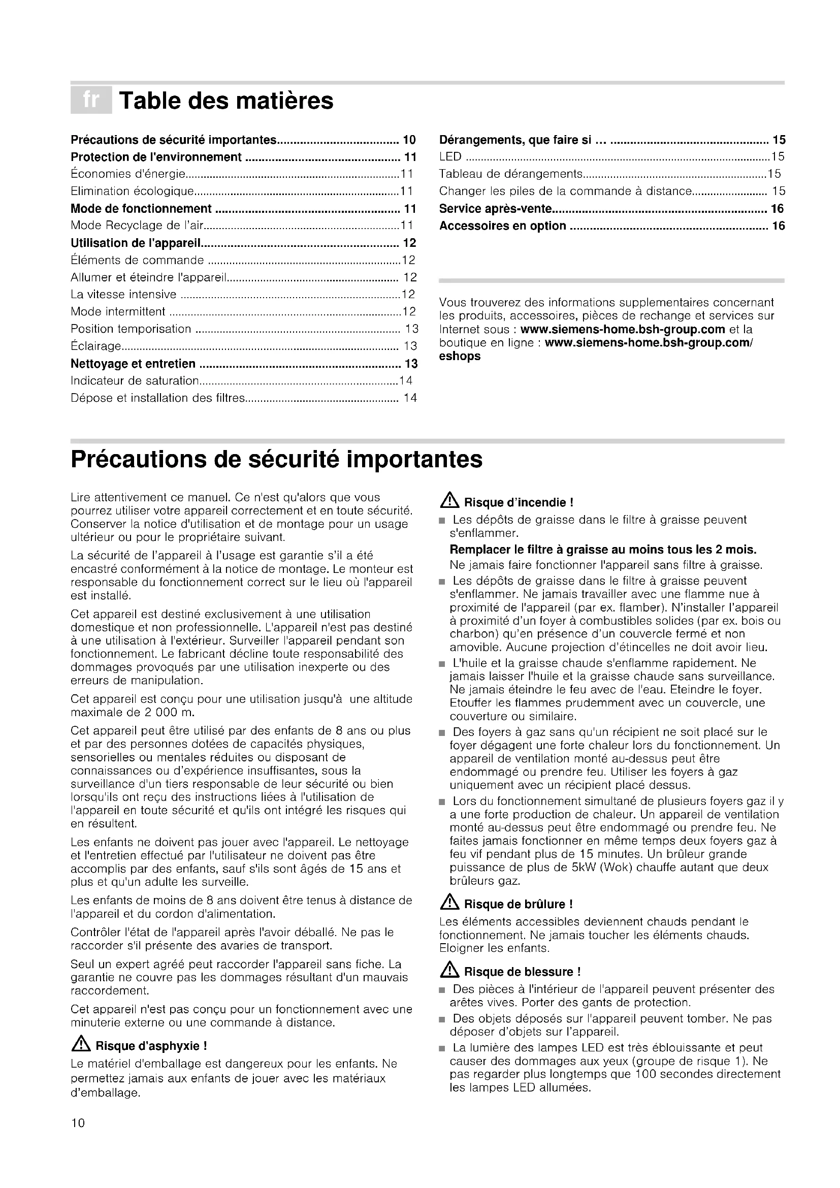 - Accessoires en option Produktinfo Vous trouverez des informations supplementaires concernant les produits, accessoires, pièces de rechange et services sur Internet sous : www.siemens-home.bsh-group.com et la boutique en ligne : www.siemens-home.bsh-group.com/ eshops Précautions de sécurité importantes Lire attentivement ce manuel. Ce n'est qu'alors que vous pourrez utiliser votre appareil correctement et en toute sécurité. Conserver la notice d'utilisation et de montage pour un usage ultérieur ou pour le propriétaire suivant. La sécurité de l’appareil à l’usage est garantie s’il a été encastré conformément à la notice de montage. Le monteur est responsable du fonctionnement correct sur le lieu où l'appareil est installé. Cet appareil est destiné exclusivement à une utilisation domestique et non professionnelle. L'appareil n'est pas destiné à une utilisation à l'extérieur. Surveiller l'appareil pendant son fonctionnement. Le fabricant décline toute responsabilité des dommages provoqués par une utilisation inexperte ou des erreurs de manipulation. Cet appareil est conçu pour une utilisation jusqu'à une altitude maximale de 2 000 m. Cet appareil peut être utilisé par des enfants de 8 ans ou plus et par des personnes dotées de capacités physiques, sensorielles ou mentales réduites ou disposant de connaissances ou d’expérience insuffisantes, sous la surveillance d'un tiers responsable de leur sécurité ou bien lorsqu'ils ont reçu des instructions liées à l'utilisation de l'appareil en toute sécurité et qu'ils ont intégré les risques qui en résultent. Les enfants ne doivent pas jouer avec l'appareil. Le nettoyage et l'entretien effectué par l'utilisateur ne doivent pas être accomplis par des enfants, sauf s'ils sont âgés de 15 ans et plus et qu'un adulte les surveille. Les enfants de moins de 8 ans doivent être tenus à distance de l'appareil et du cordon d'alimentation. Contrôler l'état de l'appareil après l'avoir déballé. Ne pas le raccorder s'il présente des avaries de transport. Seul un expert agréé peut raccorder l'appareil sans fiche. La garantie ne couvre pas les dommages résultant d'un mauvais raccordement. Cet appareil n'est pas conçu pour un fonctionnement avec une minuterie externe ou une commande à distance. : Risque d'asphyxie ! Le matériel d'emballage est dangereux pour les enfants. Ne permettez jamais aux enfants de jouer avec les matériaux d’emballage. : Risque d’incendie ! ■ Les dépôts de graisse dans le filtre à graisse peuvent s'enflammer. Remplacer le filtre à graisse au moins tous les 2 mois. Ne jamais faire fonctionner l'appareil sans filtre à graisse. Risque d'incendie !■ Les dépôts de graisse dans le filtre à graisse peuvent s'enflammer. Ne jamais travailler avec une flamme nue à proximité de l'appareil (par ex. flamber). N’installer l’appareil à proximité d’un foyer à combustibles solides (par ex. bois ou charbon) qu’en présence d’un couvercle fermé et non amovible. Aucune projection d’étincelles ne doit avoir lieu. Risque d'incendie !■ L'huile et la graisse chaude s'enflamme rapidement. Ne jamais laisser l'huile et la graisse chaude sans surveillance. Ne jamais éteindre le feu avec de l'eau. Eteindre le foyer. Etouffer les flammes prudemment avec un couvercle, une couverture ou similaire. Risque d'incendie !■ Des foyers à gaz sans qu'un récipient ne soit placé sur le foyer dégagent une forte chaleur lors du fonctionnement. Un appareil de ventilation monté au-dessus peut être endommagé ou prendre feu. Utiliser les foyers à gaz uniquement avec un récipient placé dessus. Risque d'incendie !■ Lors du fonctionnement simultané de plusieurs foyers gaz il y a une forte production de chaleur. Un appareil de ventilation monté au-dessus peut être endommagé ou prendre feu. Ne faites jamais fonctionner en même temps deux foyers gaz à feu vif pendant plus de 15 minutes. Un brûleur grande puissance de plus de 5kW (Wok) chauffe autant que deux brûleurs gaz. : Risque de brûlure ! Les éléments accessibles deviennent chauds pendant le fonctionnement. Ne jamais toucher les éléments chauds. Eloigner les enfants. : Risque de blessure ! ■ Des pièces à l'intérieur de l'appareil peuvent présenter des arêtes vives. Porter des gants de protection. Risque de blessure !■ Des objets déposés sur l'appareil peuvent tomber. Ne pas déposer d’objets sur l’appareil. Risque de blessure !■ La lumière des lampes LED est très éblouissante et peut causer des dommages aux yeux (groupe de risque 1). Ne pas regarder plus longtemps que 100 secondes directement les lampes LED allumées.11 : Risque de choc électrique ! ■ Un appareil défectueux peut provoquer un choc électrique. Ne jamais mettre en service un appareil défectueux. Débrancher la fiche secteur ou enlever le fusible dans le boîtier à fusibles. Appeler le service après-vente. Risque de choc électrique ! ■ Tenter de réparer vous-même l'appareil est dangereux. Seul un technicien du service après-vente formé par nos soins est habilité à effectuer des réparations et à remplacer des câbles d'alimentation défectueux. Si l'appareil est défectueux, débrancher la fiche secteur ou enlever le fusible dans le boîtier à fusibles. Appeler le service après-vente. Risque de choc électrique ! ■ De l'humidité qui pénètre peut occasionner un choc électrique. Ne pas utiliser de nettoyeur haute pression ou de nettoyeur à vapeur. Causes de dommages Attention ! Risque de détérioration par la corrosion. Toujours allumer l'appareil pendant la cuisson afin d'éviter la formation de condensation. La condensation peut provoquer de la corrosion. Risque de détérioration par pénétration d'humidité dans l'électronique. Ne jamais nettoyer les éléments de commande avec un chiffon mouillé. Les surfaces peuvent être endommagées par un nettoyage non conforme. Nettoyer les surfaces en i
