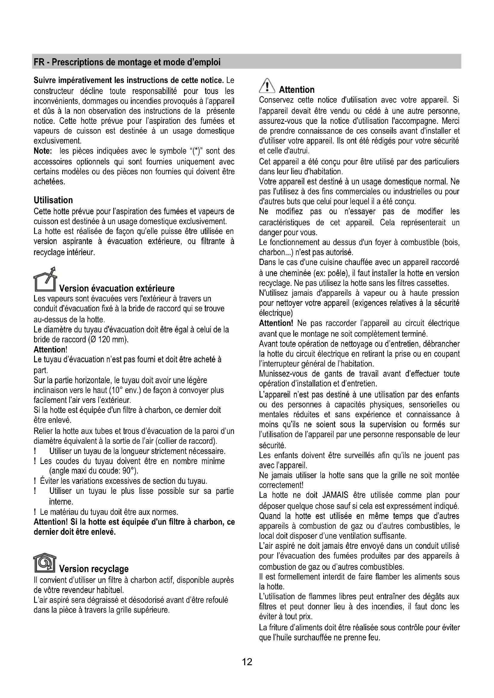 - Service Après-Vente FR - Prescriptions de montage et mode d’emploi Suivre impérativement les instructions de cette notice. Le constructeur décline toute responsabilité pour tous les inconvénients, dommages ou incendies provoqués à l’appareil et dûs à la non observation des instructions de la présente notice. Cette hotte prévue pour l’aspiration des fumées et vapeurs de cuisson est destinée à un usage domestique exclusivement. Note: les pièces indiquées avec le symbole “(*)” sont des accessoires optionnels qui sont fournies uniquement avec certains modèles ou des pièces non fournies qui doivent être achetées. Utilisation Cette hotte prévue pour l’aspiration des fumées et vapeurs de cuisson est destinée à un usage domestique exclusivement. La hotte est réalisée de façon qu’elle puisse être utilisée en version aspirante à évacuation extérieure, ou filtrante à recyclage intérieur. Version évacuation extérieure Les vapeurs sont évacuées vers l'extérieur à travers un conduit d'évacuation fixé à la bride de raccord qui se trouve au-dessus de la hotte. Le diamètre du tuyau d'évacuation doit être égal à celui de la bride de raccord (Ø 120 mm). Attention! Le tuyau d’évacuation n’est pas fourni et doit être acheté à part. Sur la partie horizontale, le tuyau doit avoir une légère inclinaison vers le haut (10° env.) de façon à convoyer plus facilement l’air vers l’extérieur. Si la hotte est équipée d'un filtre à charbon, ce dernier doit être enlevé. Relier la hotte aux tubes et trous d’évacuation de la paroi d’un diamètre équivalent à la sortie de l’air (collier de raccord). ! Utiliser un tuyau de la longueur strictement nécessaire. ! Les coudes du tuyau doivent être en nombre minime (angle maxi du coude: 90°). ! Éviter les variations excessives de section du tuyau. ! Utiliser un tuyau le plus lisse possible sur sa partie interne. ! Le matériau du tuyau doit être aux normes. Attention! Si la hotte est équipée d'un filtre à charbon, ce dernier doit être enlevé. Version recyclage Il convient d’utiliser un filtre à charbon actif, disponible auprès de vôtre revendeur habituel. L’air aspiré sera dégraissé et désodorisé avant d’être refoulé dans la pièce à travers la grille supérieure. Attention Conservez cette notice d'utilisation avec votre appareil. Si l'appareil devait être vendu ou cédé à une autre personne, assurez-vous que la notice d'utilisation l'accompagne. Merci de prendre connaissance de ces conseils avant d'installer et d'utiliser votre appareil. Ils ont été rédigés pour votre sécurité et celle d'autrui. Cet appareil a été conçu pour être utilisé par des particuliers dans leur lieu d'habitation. Votre appareil est destiné à un usage domestique normal. Ne pas l'utilisez à des fins commerciales ou industrielles ou pour d'autres buts que celui pour lequel il a été conçu. Ne modifiez pas ou n'essayer pas de modifier les caractéristiques de cet appareil. Cela représenterait un danger pour vous. Le fonctionnement au dessus d'un foyer à combustible (bois, charbon ) n'est pas autorisé. Dans le cas d'une cuisine chauffée avec un appareil raccordé à une cheminée (ex: poêle), il faut installer la hotte en version recyclage. Ne pas utilisez la hotte sans les filtres cassettes. N'utilisez jamais d'appareils à vapeur ou à haute pression pour nettoyer votre appareil (exigences relatives à la sécurité électrique) Attention! Ne pas raccorder l’appareil au circuit électrique avant que le montage ne soit complètement terminé. Avant toute opération de nettoyage ou d’entretien, débrancher la hotte du circuit électrique en retirant la prise ou en coupant l’interrupteur général de l’habitation. Munissez-vous de gants de travail avant d’effectuer toute opération d’installation et d’entretien. L’appareil n’est pas destiné à une utilisation par des enfants ou des personnes à capacités physiques, sensorielles ou mentales réduites et sans expérience et connaissance à moins qu’ils ne soient sous la supervision ou formés sur l’utilisation de l’appareil par une personne responsable de leur sécurité. Les enfants doivent être surveillés afin qu’ils ne jouent pas avec l’appareil. Ne jamais utiliser la hotte sans que la grille ne soit montée correctement! La hotte ne doit JAMAIS être utilisée comme plan pour déposer quelque chose sauf si cela est expressément indiqué. Quand la hotte est utilisée en même temps que d’autres appareils à combustion de gaz ou d’autres combustibles, le local doit disposer d’une ventilation suffisante. L’air aspiré ne doit jamais être envoyé dans un conduit utilisé pour l’évacuation des fumées produites par des appareils à combustion de gaz ou d’autres combustibles. Il est formellement interdit de faire flamber les aliments sous la hotte. L’utilisation de flammes libres peut entraîner des dégâts aux filtres et peut donner lieu à des incendies, il faut donc les éviter à tout prix. La friture d’aliments doit être réalisée sous contrôle pour éviter que l’huile surchauffée ne prenne feu.13 Les pièces accessibles peuvent se réchauffer de façon importante quand elles sont utilisées avec des appareils pour la cuisson. En ce qui concerne les mesures techniques et de sécurité à adopter pour l’évacuation des fumées, s’en tenir strictement à ce qui est prévu dans les règlements des autorités locales compétentes. La hotte doit être régulièrement nettoyée, aussi bien à l’intérieur qu’à l’extérieur (AU MOINS UNE FOIS PAR MOIS, respecter néanmoins les instructions relatives à l’entretien fournies dans ce manuel). La non observation de ces normes de nettoyage de la hotte et du changement et nettoyage des filtres comporte des risques d’incendie. Ne pas utiliser ou laisser la hotte sans que les ampoules soient correctement plac