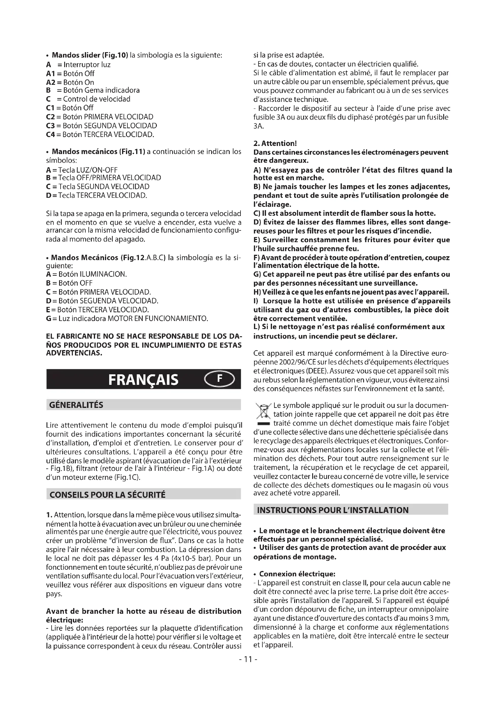 - CommandesLumineux (Fig.9) le symbole sont le suivant: A = Touche ECLAIRAGE B = Touche OFF C = Touche PREMIERE VITESSE D = Touche DEUXIEME VITESSE E = Touche TROISIEME VITESSE F = Touche MINUTEUR ARRET AUTOMATIQUE 15 minutes (*) Si votre appareil est équipé de la fonction vitesse INTENSIVE, en partant de la TROISIEME vitesse et en maintenant appuyée la touche E pendant environ 2 secondes, cette vitesse sera activée pendant 10 minutes après lesquelles l’appareil se remettra à la vitesse précédemment configurée. Quand la fonction est activée, la LED clignote. Pour interrompre cette vitesse avant les 10 minutes appuyer sur la touche E. Pour certains modèles on peut même activer la fonction avec la première et la deuxième vitesse. En appuyant sur le bouton F pendant 2 secondes (lorsque la hotte est allumée), la fonction «clean air» s’active. Cette fonction démarre le moteur pour 10 minutes par heure à la première vitesse. Dès que la fonction est activée, le moteur démarre en 1 ère vitesse pour 10 minutes pendant lesquelles les boutons F et C doivent clignoter en même temps. A la fin de ce temps, le moteur s’arrête et la diode électroluminescente du bouton F reste allumée sans clignoter jusqu’à ce que le moteur reparte en 1 ère vitesse 50 minutes plus tard. Les diodes électroluminescentes F et C recommencent à clignoter pen- dant 10 minutes et ainsi de suite. En appuyant sur n’importe quelle touche à l’exception des touches de lumière, la hotte retourne immédiatement à son fonctionnement normal (ex. en appuyant sur le bouton D la fonction «clean air» se désactive et le moteur passe directement à la 2 ème vitesse; en appuyant sur le bouton B la fonction se désactive). (*)La fonction “MINUTER ARRÊT AUTOMATIQUE” retarde l’arrêt de la hotte, qui continuera de fonctionner à la vitesse de service en cours au moment de l’activation de cette fonction, pendant 15 minutes.