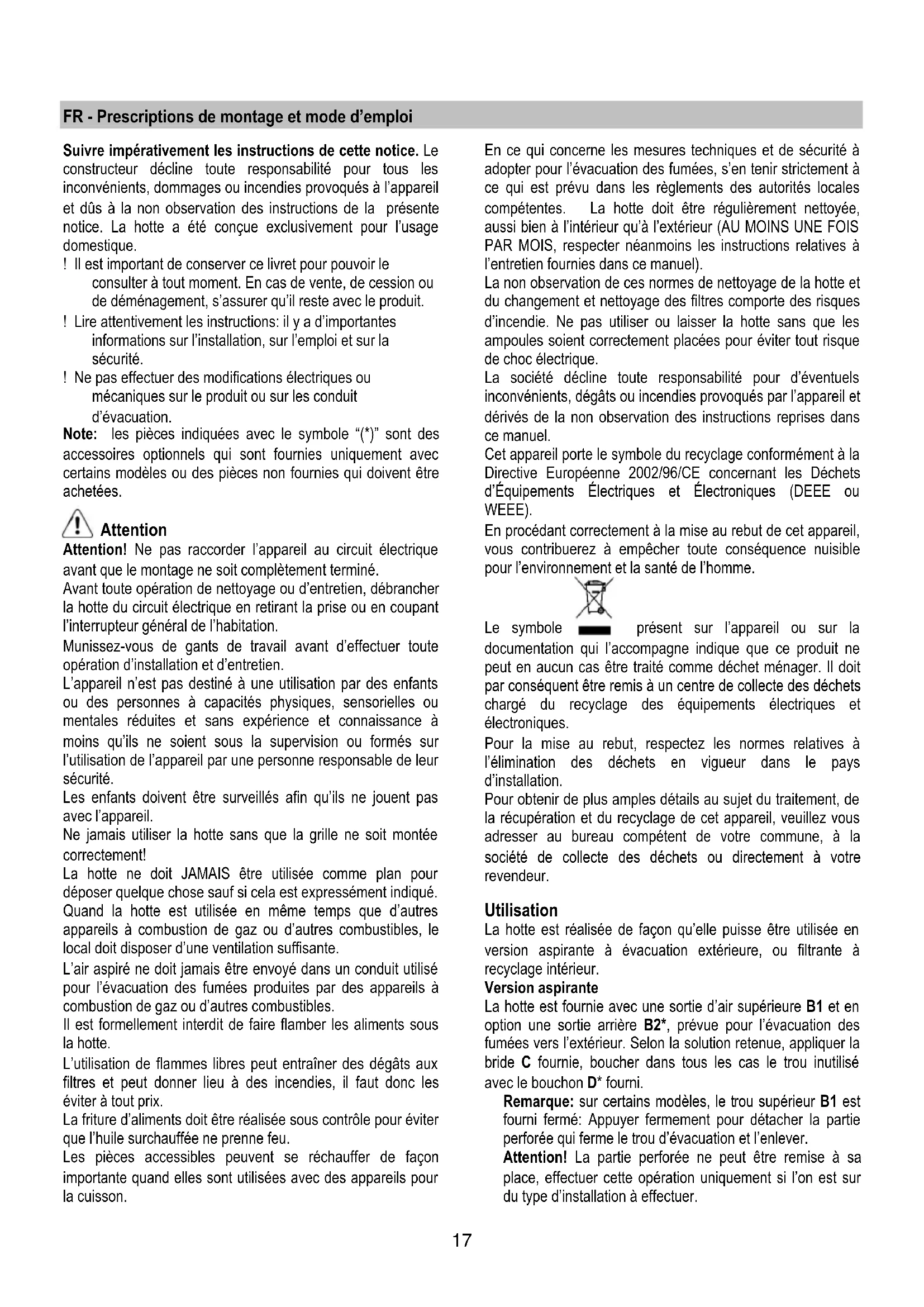 Suivre impératifement les instructions de cette notice. Le constructeur décline toute responsabilité pour tous les inconvénients, dommages ou incendies provoqués à l'appareil et dûs à la non observation des instructions de la présente notice. La hotte a été concise exclusivement pour l'usage domestique.