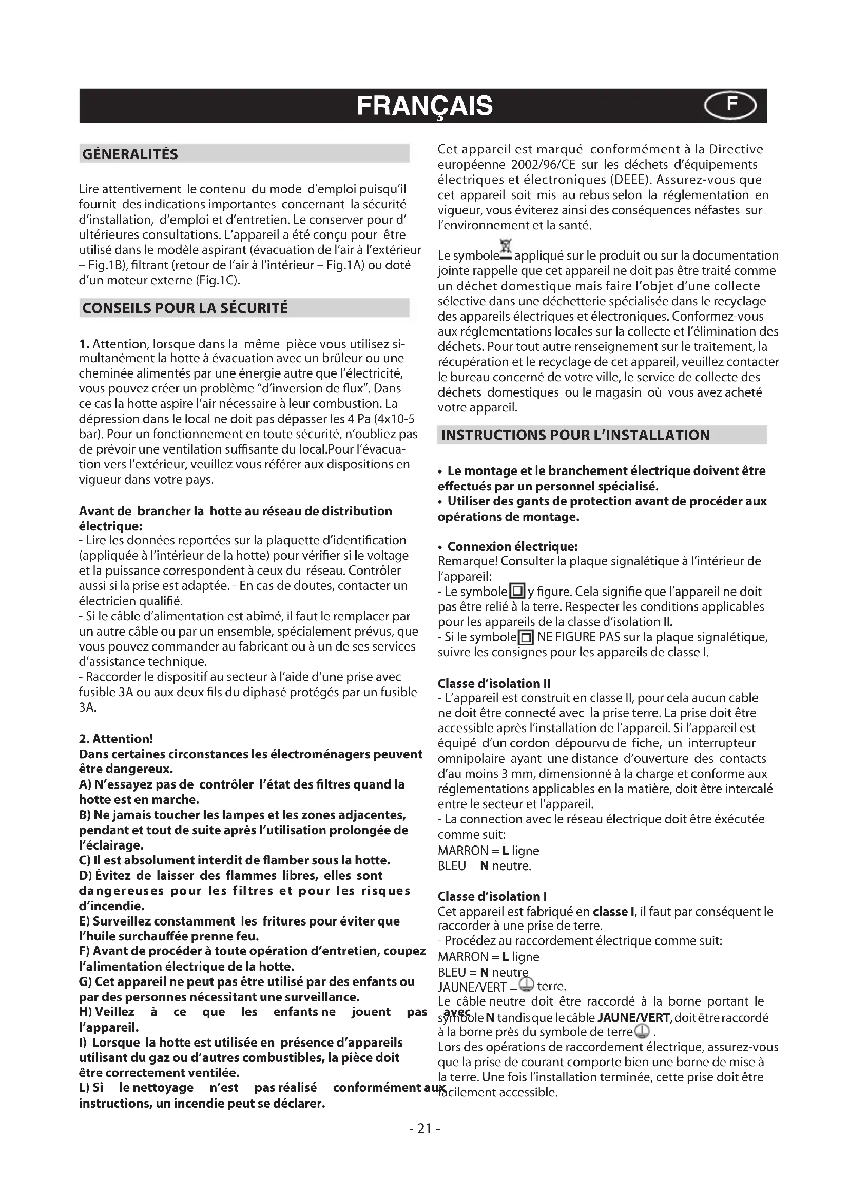 - Connexionélectrique: Remarque! Consulter la plaque signalétique à l’intérieur de l’appareil: - Le symbole y gure. Cela signie que l’appareil ne doit pas être relié à la terre. Respecter les conditions applicables pour les appareils de la classe d’isolation II. - Si le symbole NE FIGURE PAS sur la plaque signalétique, suivre les consignes pour les appareils de classe I. Classe d’isolation II - L’appareil est construit en classe II, pour cela aucun cable ne doit être connecté avec la prise terre. La prise doit être accessible après l’installation de l’appareil. Si l’appareil est équipé d’un cordon dépourvu de fiche, un interrupteur omnipolaire ayant une distance d’ouverture des contacts d’au moins 3 mm, dimensionné à la charge et conforme aux réglementations applicables en la matière, doit être intercalé entre le secteur et l’appareil. - La connection avec le réseau électrique doit être éxécutée comme suit: MARRON = L ligne BLEU = N neutre. Classe d’isolation I Cet appareil est fabriqué en classe I, il faut par conséquent le raccorder à une prise de terre. - Procédez au raccordement électrique comme suit: MARRON = L ligne BLEU = N neutre JAUNE/VERT = terre. Le câble neutre doit être raccordé à la borne portant le symbole N tandis que le câble JAUNE/VERT, doit être raccordé à la borne près du symbole de terre