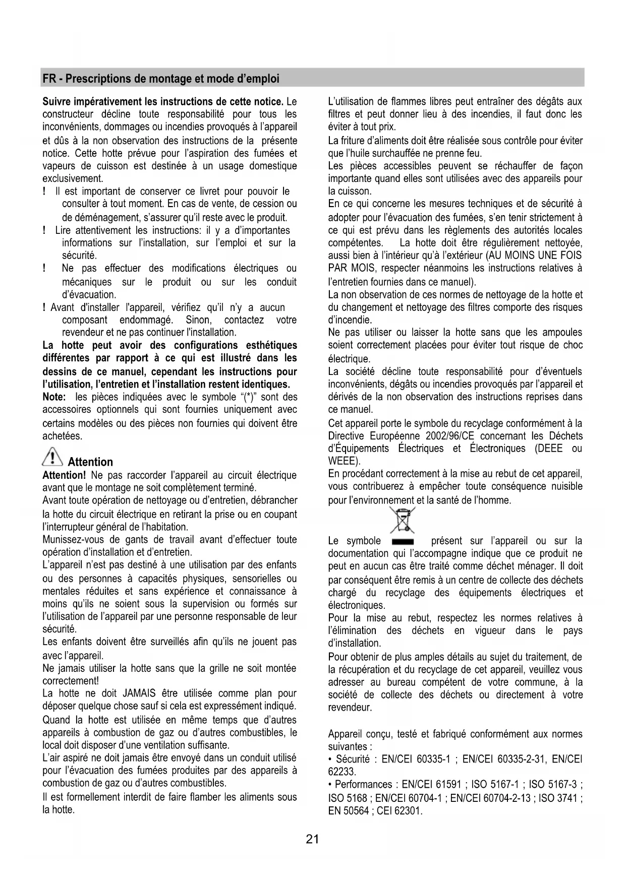 recommendations of the cooker hood and replacement of the filters may cause fire risks. Therefore, we recommend observing these instructions. The manufacturer declines all responsibility for any damage to the motor or any fire damage linked to inappropriate maintenance or failure to observe the above safety recommendations. Grease filter Fig. 2 Traps cooking grease particles. The grease filter must be cleaned once a month using non aggressive detergents, either by hand or in the dishwasher, which must be set to a low temperature and a short cycle. When washed in a dishwasher, the grease filter may discolour slightly, but this does not affect its filtering capacity. To remove the grease filter, pull the spring release handle. Charcoal filter (filter version only) Fig. 3 It absorbs unpleasant odours caused by cooking. The saturation of the charcoal filter occurs after more or less prolonged use, depending on the type of cooking and the regularity of cleaning of the grease filter. In any case it is necessary to replace the cartridge at least every four mounths. The charcoal filter may NOT be washed or regenerated. Remove the filter holder frame by turning the knobs (g) 90° that affix the chimney to the cooker hood. Insert the pad (i) of activated carbon into the frame (h) and fit the whole back into its housing (j). It is possible to use a traditional carbon filter, neither washable nor regenerable, to be replaced every 3 - 4 months. The filter holder frame of the carbon filter is welded together; the eventual frame supplied with the hood is not, therefore, to be used. Insert it into its housing and fix it turning the 2 plastic knobs. Replacing lamps The hood is equipped with a lighting system based on LED technology. The LEDs guarantee an optimum lighting, a duration up to 10 times as long as the traditional lamps and allow to save 90% electrical energy. For replacement, contact the technical service.21 FR - Prescriptions de montage et mode d’emploi Suivre impérativement les instructions de cette notice. Le constructeur décline toute responsabilité pour tous les inconvénients, dommages ou incendies provoqués à l’appareil et dûs à la non observation des instructions de la présente notice. Cette hotte prévue pour l’aspiration des fumées et vapeurs de cuisson est destinée à un usage domestique exclusivement. ! Il est important de conserver ce livret pour pouvoir le consulter à tout moment. En cas de vente, de cession ou de déménagement, s’assurer qu’il reste avec le produit. ! Lire attentivement les instructions: il y a d’importantes informations sur l’installation, sur l’emploi et sur la sécurité. ! Ne pas effectuer des modifications électriques ou mécaniques sur le produit ou sur les conduit d’évacuation. ! Avant d'installer l'appareil, vérifiez qu’il n’y a aucun composant endommagé. Sinon, contactez votre revendeur et ne pas continuer l'installation. La hotte peut avoir des configurations esthétiques différentes par rapport à ce qui est illustré dans les dessins de ce manuel, cependant les instructions pour l’utilisation, l’entretien et l’installation restent identiques. Note: les pièces indiquées avec le symbole “(*)” sont des accessoires optionnels qui sont fournies uniquement avec certains modèles ou des pièces non fournies qui doivent être achetées. Attention Attention! Ne pas raccorder l’appareil au circuit électrique avant que le montage ne soit complètement terminé. Avant toute opération de nettoyage ou d’entretien, débrancher la hotte du circuit électrique en retirant la prise ou en coupant l’interrupteur général de l’habitation. Munissez-vous de gants de travail avant d’effectuer toute opération d’installation et d’entretien. L’appareil n’est pas destiné à une utilisation par des enfants ou des personnes à capacités physiques, sensorielles ou mentales réduites et sans expérience et connaissance à moins qu’ils ne soient sous la supervision ou formés sur l’utilisation de l’appareil par une personne responsable de leur sécurité. Les enfants doivent être surveillés afin qu’ils ne jouent pas avec l’appareil. Ne jamais utiliser la hotte sans que la grille ne soit montée correctement! La hotte ne doit JAMAIS être utilisée comme plan pour déposer quelque chose sauf si cela est expressément indiqué. Quand la hotte est utilisée en même temps que d’autres appareils à combustion de gaz ou d’autres combustibles, le local doit disposer d’une ventilation suffisante. L’air aspiré ne doit jamais être envoyé dans un conduit utilisé pour l’évacuation des fumées produites par des appareils à combustion de gaz ou d’autres combustibles. Il est formellement interdit de faire flamber les aliments sous la hotte. L’utilisation de flammes libres peut entraîner des dégâts aux filtres et peut donner lieu à des incendies, il faut donc les éviter à tout prix. La friture d’aliments doit être réalisée sous contrôle pour éviter que l’huile surchauffée ne prenne feu. Les pièces accessibles peuvent se réchauffer de façon importante quand elles sont utilisées avec des appareils pour la cuisson. En ce qui concerne les mesures techniques et de sécurité à adopter pour l’évacuation des fumées, s’en tenir strictement à ce qui est prévu dans les règlements des autorités locales compétentes. La hotte doit être régulièrement nettoyée, aussi bien à l’intérieur qu’à l’extérieur (AU MOINS UNE FOIS PAR MOIS, respecter néanmoins les instructions relatives à l’entretien fournies dans ce manuel). La non observation de ces normes de nettoyage de la hotte et du changement et nettoyage des filtres comporte des risques d’incendie. Ne pas utiliser ou laisser la hotte sans que les ampoules soient correctement placées pour éviter tout risque de choc électrique. La société décline toute responsabilité pour d’éventuels inconvénients, 