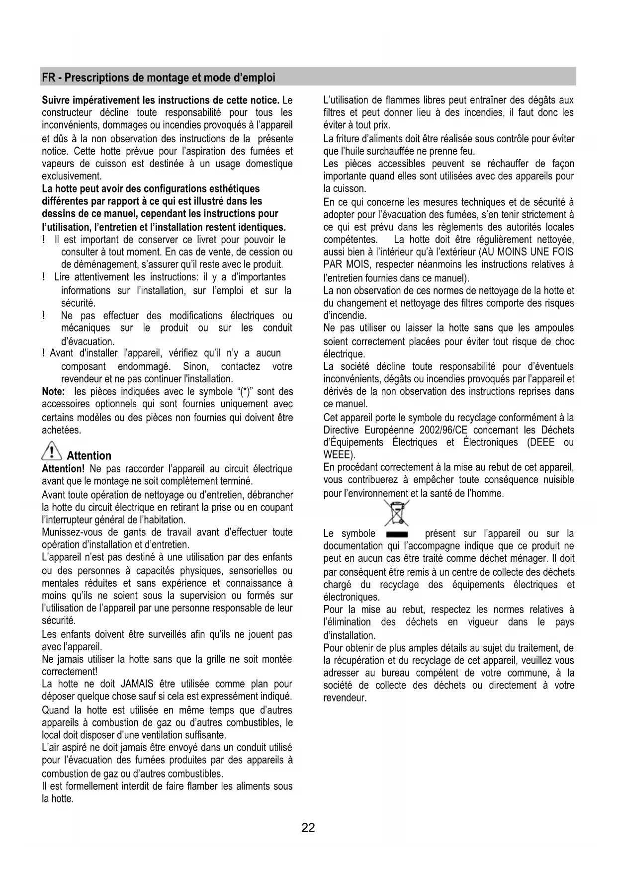 Suivre impératifement les instructions de cette notice. Le constructeur décline toute responsabilité pour tous les inconvénients, dommages ou incendies provoqués à l'appareil et dûs à la non observation des instructions de la presente notice. Cette hotte prévue pour l'aspiration des fumées et vapeurs de cuisson est destinée à un usage domestique exclusivement.