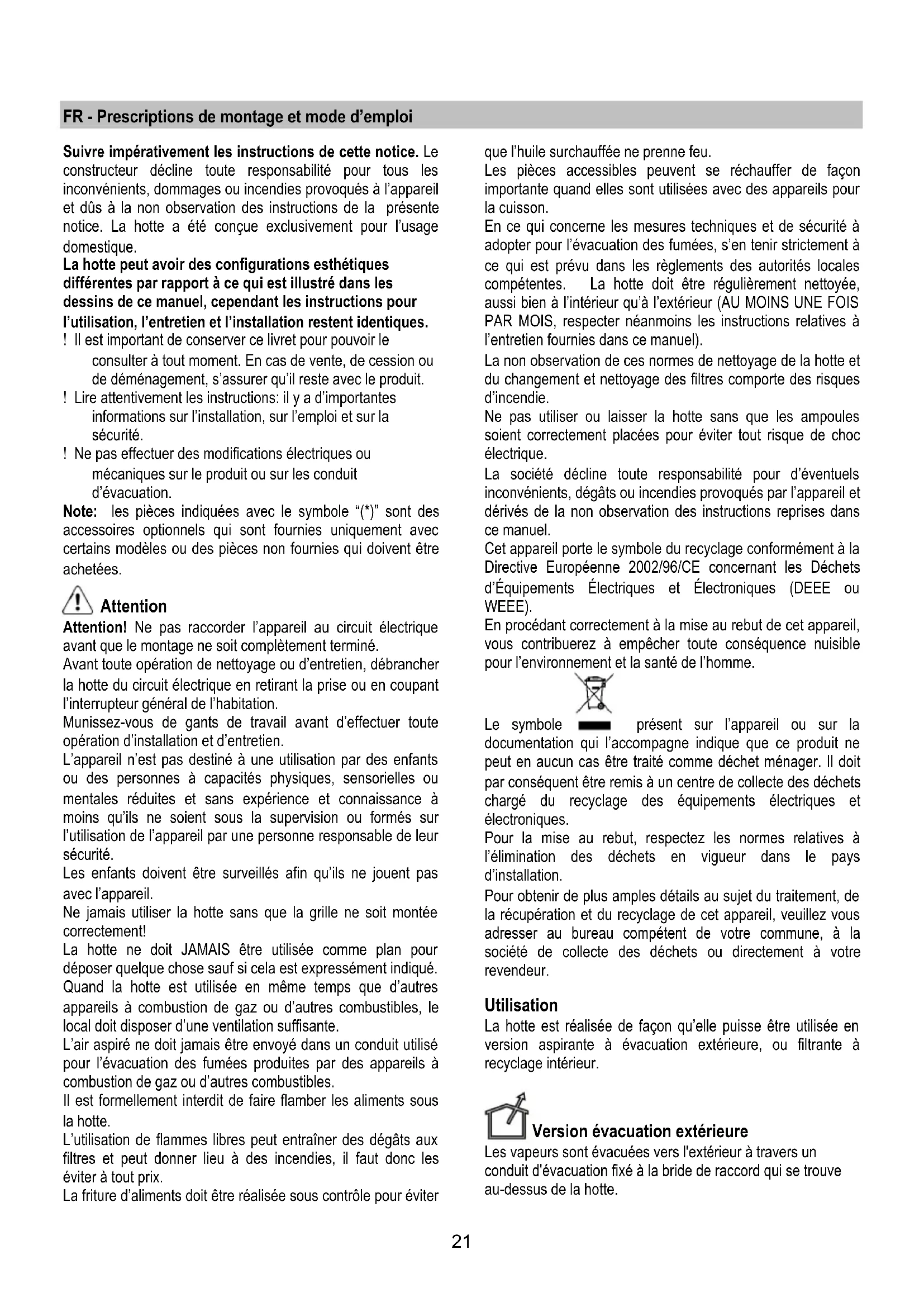 If the lights do not work, make sure that the lamps are fitted properly into their housings before you call for technical assistance.21 FR - Prescriptions de montage et mode d’emploi Suivre impérativement les instructions de cette notice. Le constructeur décline toute responsabilité pour tous les inconvénients, dommages ou incendies provoqués à l’appareil et dûs à la non observation des instructions de la présente notice. La hotte a été conçue exclusivement pour l’usage domestique. La hotte peut avoir des configurations esthétiques différentes par rapport à ce qui est illustré dans les dessins de ce manuel, cependant les instructions pour l’utilisation, l’entretien et l’installation restent identiques. ! Il est important de conserver ce livret pour pouvoir le consulter à tout moment. En cas de vente, de cession ou de déménagement, s’assurer qu’il reste avec le produit. ! Lire attentivement les instructions: il y a d’importantes informations sur l’installation, sur l’emploi et sur la sécurité. ! Ne pas effectuer des modifications électriques ou mécaniques sur le produit ou sur les conduit d’évacuation. Note: les pièces indiquées avec le symbole “(*)” sont des accessoires optionnels qui sont fournies uniquement avec certains modèles ou des pièces non fournies qui doivent être achetées. Attention Attention! Ne pas raccorder l’appareil au circuit électrique avant que le montage ne soit complètement terminé. Avant toute opération de nettoyage ou d’entretien, débrancher la hotte du circuit électrique en retirant la prise ou en coupant l’interrupteur général de l’habitation. Munissez-vous de gants de travail avant d’effectuer toute opération d’installation et d’entretien. L’appareil n’est pas destiné à une utilisation par des enfants ou des personnes à capacités physiques, sensorielles ou mentales réduites et sans expérience et connaissance à moins qu’ils ne soient sous la supervision ou formés sur l’utilisation de l’appareil par une personne responsable de leur sécurité. Les enfants doivent être surveillés afin qu’ils ne jouent pas avec l’appareil. Ne jamais utiliser la hotte sans que la grille ne soit montée correctement! La hotte ne doit JAMAIS être utilisée comme plan pour déposer quelque chose sauf si cela est expressément indiqué. Quand la hotte est utilisée en même temps que d’autres appareils à combustion de gaz ou d’autres combustibles, le local doit disposer d’une ventilation suffisante. L’air aspiré ne doit jamais être envoyé dans un conduit utilisé pour l’évacuation des fumées produites par des appareils à combustion de gaz ou d’autres combustibles. Il est formellement interdit de faire flamber les aliments sous la hotte. L’utilisation de flammes libres peut entraîner des dégâts aux filtres et peut donner lieu à des incendies, il faut donc les éviter à tout prix. La friture d’aliments doit être réalisée sous contrôle pour éviter que l’huile surchauffée ne prenne feu. Les pièces accessibles peuvent se réchauffer de façon importante quand elles sont utilisées avec des appareils pour la cuisson. En ce qui concerne les mesures techniques et de sécurité à adopter pour l’évacuation des fumées, s’en tenir strictement à ce qui est prévu dans les règlements des autorités locales compétentes. La hotte doit être régulièrement nettoyée, aussi bien à l’intérieur qu’à l’extérieur (AU MOINS UNE FOIS PAR MOIS, respecter néanmoins les instructions relatives à l’entretien fournies dans ce manuel). La non observation de ces normes de nettoyage de la hotte et du changement et nettoyage des filtres comporte des risques d’incendie. Ne pas utiliser ou laisser la hotte sans que les ampoules soient correctement placées pour éviter tout risque de choc électrique. La société décline toute responsabilité pour d’éventuels inconvénients, dégâts ou incendies provoqués par l’appareil et dérivés de la non observation des instructions reprises dans ce manuel. Cet appareil porte le symbole du recyclage conformément à la Directive Européenne 2002/96/CE concernant les Déchets d’Équipements Électriques et Électroniques (DEEE ou WEEE). En procédant correctement à la mise au rebut de cet appareil, vous contribuerez à empêcher toute conséquence nuisible pour l’environnement et la santé de l’homme. Le symbole présent sur l’appareil ou sur la documentation qui l’accompagne indique que ce produit ne peut en aucun cas être traité comme déchet ménager. Il doit par conséquent être remis à un centre de collecte des déchets chargé du recyclage des équipements électriques et électroniques. Pour la mise au rebut, respectez les normes relatives à l’élimination des déchets en vigueur dans le pays d’installation. Pour obtenir de plus amples détails au sujet du traitement, de la récupération et du recyclage de cet appareil, veuillez vous adresser au bureau compétent de votre commune, à la société de collecte des déchets ou directement à votre revendeur. Utilisation La hotte est réalisée de façon qu’elle puisse être utilisée en version aspirante à évacuation extérieure, ou filtrante à recyclage intérieur. Version évacuation extérieure Les vapeurs sont évacuées vers l'extérieur à travers un conduit d'évacuation fixé à la bride de raccord qui se trouve au-dessus de la hotte.22 Attention! Le tuyau d’évacuation n’est pas fourni et doit être acheté à part. Le diamètre du tuyau d'évacuation doit être égal à celui de la bride de raccord. Sur la partie horizontale, le tuyau doit avoir une légère inclinaison vers le haut (10° env.) de façon à convoyer plus facilement l’air vers l’extérieur. Si la hotte est équipée d'un filtre à charbon, ce dernier doit être enlevé. Relier la hotte aux tubes et trous d’évacuation de la paroi d’un diamètr