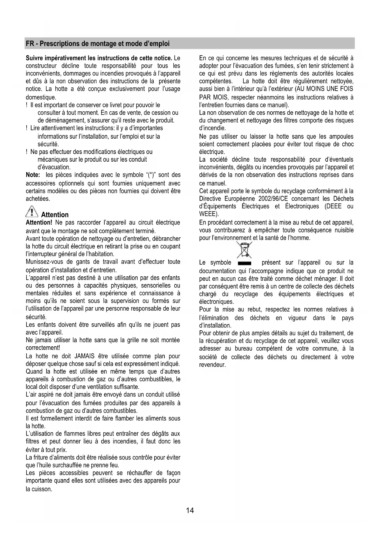 | Maintenance et Réparation | Filtres à graisse lavables en machine, entretien régulier recommandé tous les 3 mois, possibilité de remplacer le moteur en cas de défaillance. |